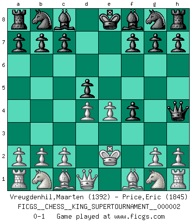 Last move : 0-1 2018 June 7 1:20:58 [Event "FICGS__CHESS__KING_SUPERTOURNAMENT__000002"] [Site "FICGS"] [Date "2018.05.01"] [Round "1"] [White "Vreugdenhil,Maarten"] [Black "Price,Eric"] [Result "0-1"] [WhiteElo "1392"] [BlackElo "1845"] 1.e4 e5 2.f4 exf4 3.d4 Qh4+ 4.Ke2 d5 0-1 This chess game has been lost on time (started : 2018.05.01 22:10:15) KGA : Villemson (Steinitz) gambit Player Black won this chess game. Follow this game move after move (download)A man that will take back a move at Chess will pick a pocket. (Richard Fenton) Ich spiele ehrlich und spiele, um zu gewinnen. Wenn ich verliere nehme ich meine Medizin. (Robert James Fischer) Cuando no sepas que mover, espera por una idea que se le venga a la la cabeza de tu oponente. Tenlo por seguro de que esa idea estará incorrecta. (Siegbert Tarrasch) Il s'avisa de me proposer d'apprendre les échecs qu'il jouait un peu... me voilà forcené des échecs. J'achète un échiquier, je m'enferme dans ma chambre, j'y passe des jours et des nuits à vouloir apprendre par cur toutes les parties. (Jean-Jacques Rousseau, Confessions) A mistake is only a mistake if you let it happen twice. Otherwise it is a learning experience. (Daniel Parmet)