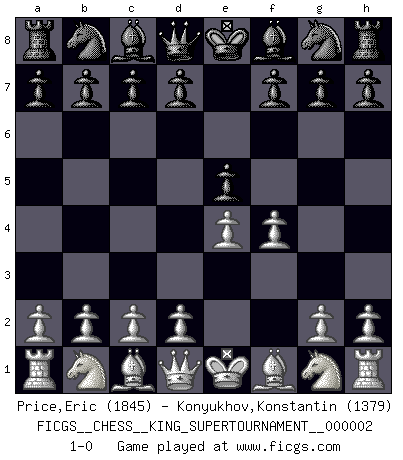 Last move : 1-0 2018 June 1 0:38:7 [Event "FICGS__CHESS__KING_SUPERTOURNAMENT__000002"] [Site "FICGS"] [Date "2018.05.01"] [Round "1"] [White "Price,Eric"] [Black "Konyukhov,Konstantin"] [Result "1-0"] [WhiteElo "1845"] [BlackElo "1379"] 1.e4 e5 2.f4 1-0 This chess game has been lost on time (started : 2018.05.01 22:10:15) King's gambit Player White won this chess game. Follow this game move after move (download)Any material change in a position must come about by mate, a capture, or a Pawn promotion. (Purdy) Alle offensichtlichen Züge sehen nach dem Spiel in der Analyse verdächtig aus. (Viktor Kortschnoi) Nos gusta pensar. (Gary Kasparov) Les échecs c'est le défi de l'alpiniste, toujours plus haut, prêt à tout pour monter à l'assaut du Roi ennemi. Les échecs, c'est de la musique en mouvement, un ballet majestueux pour les yeux. C'est de la poésie composée par les fantômes du passé qui au même titre que Rimbaud ou Verlaine méritent notre admiration. Les échecs, c'est de la peinture ou le moindre mouvement modifie le tableau pour en faire un Picasso ou un Van Gogh. Les échecs, c'est tout et rien, c'est la vie et la mort. Jjulie33 sur le forum de France-Echecs. Methinks King Thibault should dub Marius Zubac a knight of the square board... I mean table, henceforth addressing him as Sir Marius, and bestow on him a suitable land from the kingdom of FICGS & marry him off to a worthy, fair maiden, lest he slice our heads with his mighty sword in his wrath. (Dinesh De Silva)