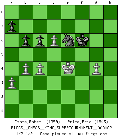 Last move : 1/2-1/2 2018 June 4 23:23:40 [Event "FICGS__CHESS__KING_SUPERTOURNAMENT__000002"] [Site "FICGS"] [Date "2018.05.01"] [Round "1"] [White "Csoma,Robert"] [Black "Price,Eric"] [Result "1/2-1/2"] [WhiteElo "1359"] [BlackElo "1845"] 1.e4 e5 2.f4 d5 3.exd5 e4 4.Nc3 Nf6 5.d3 Bb4 6.Bd2 e3 7.Bxe3 O-O 8.Be2 Re8 9.Bd2 Bg4 10.h3 Bxc3 11.Bxc3 Bxe2 12.Nxe2 Nxd5 13.Bd2 Qe7 14.Kf2 Ne3 15.Qc1 Nf5 16.Re1 Nc6 17.Kg1 Qh4 18.c3 Re7 19.Kh2 Qf2 20.Nd4 Qg3+ 21.Kh1 Nh4 22.Rg1 Nxd4 23.Be1 Rxe1 24.Qxe1 Qxe1 25.Raxe1 Ne6 26.Rgf1 Nf5 27.Kh2 g6 28.d4 c6 29.g4 Nd6 30.f5 Ng7 31.fxg6 fxg6 32.Re7 Rf8 33.Rxf8+ Kxf8 34.Rd7 Nge8 35.Rxh7 Nf7 36.Kg3 g5 37.h4 Nf6 38.Rxf7+ Kxf7 39.hxg5 Ne8 40.Kf4 Kg6 41.c4 Nd6 42.b3 Nf7 43.d5 Nxg5 44.d6 Kf6 45.b4 b6 46.a3 Ne6+ 47.Ke4 Ng5+ 48.Kd4 Ne6+ 49.Ke4 Ng5+ 50.Kd4 Ne6+ 51.Ke4 1/2-1/2 KGD : Falkbeer, 3...e4 Kingside Castling by player Black (move 7) This chess game ended in a draw. Follow this game move after move (download)Best by test: 1. e4 (Bobby Fischer) Dein Körper muss in Topform sein. Dein Schach verfällt, wenn dein Körper verfällt. Der Körper kann nicht vom Geist getrennt werden. (Robert James Fischer) Un juego de Ajedrez es un dialogo, una conversación entre un jugador y su oponente. Cada movimiento del oponente puede contener amenazas o tropiezos, pero un jugador no se puede defender de las amenazas o tomar ventaja de los tropiezos si es que no se pregunta a sí mismo: ¿Que es lo que mi oponente va a hacer después de cada movida?. (Bruce A. Moon) Un journaliste : 'Vous préférez avoir une dame de plus sur l'échiquier ou au lit ?' Boris Spassky : 'Ca dépend de la position.' Pushing plastic is for the many, pushing virtual pieces is for the fewer, pushing wood is for the very few. (Normajean Yates)