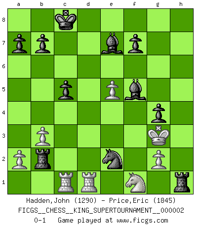 Last move : 0-1 2018 July 9 10:51:20 [Event "FICGS__CHESS__KING_SUPERTOURNAMENT__000002"] [Site "FICGS"] [Date "2018.05.01"] [Round "1"] [White "Hadden,John"] [Black "Price,Eric"] [Result "0-1"] [WhiteElo "1290"] [BlackElo "1845"] 1.e4 e5 2.f4 d5 3.d3 Nf6 4.fxe5 Ng4 5.Be2 dxe4 6.Bxg4 Qh4+ 7.Kd2 Bxg4 8.Qe1 Qh6+ 9.Qe3 Qxe3+ 10.Kxe3 exd3 11.cxd3 c5 12.Nf3 Nc6 13.Nc3 O-O-O 14.h3 Bf5 15.Rd1 Be7 16.b3 h5 17.Ne2 g5 18.Nc3 g4 19.hxg4 hxg4 20.Nd2 Rxd3+ 21.Ke2 Nd4+ 22.Ke1 Rxc3 23.Bb2 Rh1+ 24.Nf1 Re3+ 25.Kf2 Re2+ 26.Kg3 Rxb2 27.Rac1 Ne2+ 0-1 KGD : Falkbeer counter-gambit Queenside Castling by player Black (move 13) Player Black won this chess game. Follow this game move after move (download)We cannot resist the fascination of sacrifice, since a passion for sacrifices is part of a Chessplayer's nature. (Rudolf Spielman) Wer nie einen Fehler gemacht hat, hat nie etwas Neues ausprobiert. (Albert Einstein) Las Aperturas te enseñan aperturas. ¡Los Finales te enseñan Ajedrez!. (Stephan Gerzadowicz) Pour moi, les échecs ne sont pas un jeu mais un art. (Alexandre Alekhine) The problem with manipulation is that people can turn on you. (Horatio Caine, C.S.I. Miami)