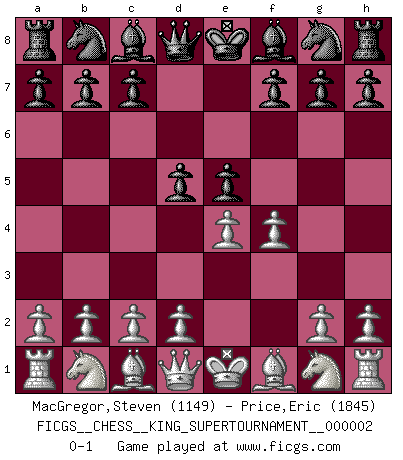 Last move : 0-1 2018 June 1 0:38:7 [Event "FICGS__CHESS__KING_SUPERTOURNAMENT__000002"] [Site "FICGS"] [Date "2018.05.01"] [Round "1"] [White "MacGregor,Steven"] [Black "Price,Eric"] [Result "0-1"] [WhiteElo "1149"] [BlackElo "1845"] 1.e4 e5 2.f4 d5 0-1 This chess game has been lost on time (started : 2018.05.01 22:10:15) KGD : Falkbeer counter-gambit Player Black won this chess game. Follow this game move after move (download)I play correspondence chess because it is both art and science while chess is art only. (A player at FICGS) Bobby Fischer ist kein Vorbild für die heutige Jugend. (Viktor Kortschnoi) No todos los artistas son jugadores de Ajedrez, pero todos los jugadores de Ajedrez son artistas. (Marcel Duchamp) Même si l'adversaire joue le coup analysé précédemment, recommencez l'analyse en voyant la nouvelle position. Première règle de Blumenfeld We cannot be sure of having something to live for unless we are willing to die for it. (Ernesto Che Guevara)