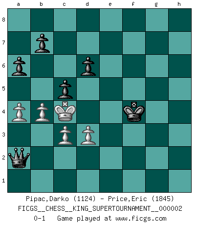 Last move : 0-1 2018 July 31 15:0:10 [Event "FICGS__CHESS__KING_SUPERTOURNAMENT__000002"] [Site "FICGS"] [Date "2018.05.01"] [Round "1"] [White "Pipac,Darko"] [Black "Price,Eric"] [Result "0-1"] [WhiteElo "1124"] [BlackElo "1845"] 1.e4 e5 2.f4 exf4 3.Nf3 g5 4.h3 Bg7 5.Nc3 d6 6.Bb5+ c6 7.Bc4 Be6 8.Bxe6 fxe6 9.d3 Nd7 10.Qd2 Qa5 11.h4 g4 12.Ng5 e5 13.Qe2 h5 14.Bd2 Nh6 15.Ne6 Kf7 16.Nxg7 Kxg7 17.g3 Raf8 18.gxf4 exf4 19.Nd5 Qd8 20.Nxf4 Qe7 21.O-O-O Ne5 22.Nxh5+ Kg8 23.Ng3 Nf3 24.Bxh6 Rxh6 25.Qg2 Rxh4 26.Nf5 Qg5+ 27.Kb1 Rxh1 28.Qxh1 Rxf5 29.exf5 Qxf5 30.Qg2 Kg7 31.b3 Kg6 32.Rf1 Nd2+ 33.Qxd2 Qxf1+ 34.Kb2 g3 35.Qe3 Qf6+ 36.Kc1 Qf1+ 37.Kd2 g2 38.Qe4+ Kg5 39.Qe3+ Kg4 40.Qe4+ Qf4+ 41.Qxf4+ Kxf4 42.Kc3 g1Q 43.a4 c5 44.Kc4 a6 45.c3 Qg2 46.b4 Qa2+ 0-1 King's knight's gambit Queenside Castling by player White (move 21) Promotion Queen by player Black (move 42) Player Black won this chess game. Follow this game move after move (download)Pawns are born free, yet they are everywhere in chains. (Rick Kennedy) Obwohl ich vom Stil her kaum zu den Priestern der Schachkunst gezählt werde, halte ich Schach doch für eine Kunst. (Tigran Petrosjan) Una buena ofensiva y una buena defensa, comienzan ambas con un buen desarrollo. (Bruce A. Moon) La menace est plus forte que l'exécution. (Aaron Nimzovitch) There are two major products that came out of Berkeley: LSD and UNIX. We do not believe this is to be a coincidence. (Jeremy S. Anderson)