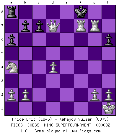 Last move : 1-0 2018 July 20 12:35:10 [Event "FICGS__CHESS__KING_SUPERTOURNAMENT__000002"] [Site "FICGS"] [Date "2018.05.01"] [Round "1"] [White "Price,Eric"] [Black "Kehayov,Yulian"] [Result "1-0"] [WhiteElo "1845"] [BlackElo "0973"] 1.e4 e5 2.f4 d5 3.exd5 Qxd5 4.Nc3 Qe6 5.fxe5 Qxe5+ 6.Be2 Be6 7.Nf3 Qd6 8.O-O Nf6 9.d4 Nc6 10.Bb5 a6 11.Bxc6+ Qxc6 12.Bg5 Be7 13.Ne5 Qb6 14.Na4 Qa7 15.c4 Bxc4 16.Nxc4 O-O 17.Ne5 h6 18.Bh4 Bd6 19.Bxf6 gxf6 20.Nd7 Rfd8 21.Rxf6 Rxd7 22.Kh1 Qb8 23.Qg4+ Kh7 24.Qxd7 Qe8 25.Rxf7+ Kg8 26.Rg7+ Kf8 27.Rf1+ Bf4 28.Rxf4+ Qf7 29.R4xf7+ 1-0 KGD : Falkbeer counter-gambit Kingside Castling by player White (move 8) Kingside Castling by player Black (move 16) Player White won this chess game. Follow this game move after move (download)When asked, -How is that you pick better moves than your opponents?, I responded: I'm very glad you asked me that, because, as it happens, there is a very simple answer. I think up my own moves, and I make my opponent think up his. (Alexander Alekhine) Wenn Dein Gegner dir ein Remis anbietet, versuch herauszufinden, weshalb er glaubt schlechter zu stehen. (Nigel Short) El Ajedrez es tan inspirador que yo no creo que un buen jugador sea capaz de tener un pensamiento malo durante una partida. (Wilhelm Steinitz) Le joueur d'Echecs qui veut atteindre le top est obligé de développer son propre credo créatif. Alexeï Stepanovicth Souétine. Il est facile d'écrire des livres ! Ce qui est difficile, c'est de jouer ! (Alexeï Stepanovicth Souétine) It's not the size of the dog in the fight, it's the size of the fight in the dog. (Mark Twain)