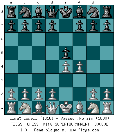 Last move : 1-0 2018 June 1 0:38:7 [Event "FICGS__CHESS__KING_SUPERTOURNAMENT__000002"] [Site "FICGS"] [Date "2018.05.01"] [Round "1"] [White "Liwat,Lowell"] [Black "Vasseur,Romain"] [Result "1-0"] [WhiteElo "1818"] [BlackElo "1800"] 1.e4 e5 2.f4 1-0 This chess game has been lost on time (started : 2018.05.01 22:10:15) King's gambit Player White won this chess game. Follow this game move after move (download)A Chess game is a dialogue, a conversation between a player and his opponent. Each move by the opponent may contain threats or be a blunder, but a player cannot defend against threats or take advantage of blunders if he does not first ask himself: What is my opponent planning after each move ? (Bruce A. Moon) Karpov ist ein Museumsstück. (Garry Kasparov) Una compensación adecuada por un sacrificio es tener una combinación sólida que conduce a una posición ganadora; una compensación adecuada por una metida de pata es dejar a tu oponente arrebatar una derrota de las fauces de la victoria. (Bruce A. Moon) Même si vous avez un bon coup à faire, regardez toujours s'il n'y en a pas un qui lui soit préférable. (Pedro Damiano) If things go wrong, don't go with them. (Roger Babson)
