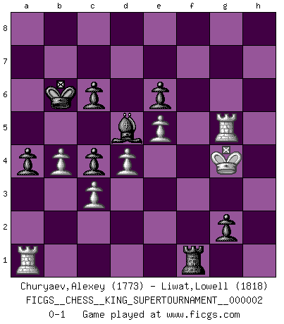Last move : 0-1 2018 May 15 12:51:19 [Event "FICGS__CHESS__KING_SUPERTOURNAMENT__000002"] [Site "FICGS"] [Date "2018.05.01"] [Round "1"] [White "Churyaev,Alexey"] [Black "Liwat,Lowell"] [Result "0-1"] [WhiteElo "1773"] [BlackElo "1818"] 1.e4 e5 2.f4 exf4 3.Nf3 Be7 4.g3 g5 5.d4 fxg3 6.hxg3 h5 7.Qd2 g4 8.Nh4 d5 9.e5 Nh6 10.Bd3 Bxh4 11.Rxh4 Nf5 12.Bxf5 Bxf5 13.Nc3 Nc6 14.a3 Be6 15.Ne2 Qe7 16.Nf4 O-O-O 17.b4 Bf5 18.c3 Be4 19.a4 Bf3 20.Kf2 Rde8 21.Ba3 Qg5 22.Bc1 Nd8 23.Qb2 Qf5 24.a5 c6 25.Be3 a6 26.Rc1 Ne6 27.Nxe6 fxe6 28.Bf4 Qd3 29.Qc2 Qc4 30.Re1 Be4 31.Qd2 Ref8 32.Ke3 Rf5 33.Re2 Kc7 34.Reh2 b6 35.axb6+ Kxb6 36.Re2 Ra8 37.Re1 a5 38.Ra1 a4 39.Ra3 Raf8 40.Qe2 Rxf4 41.gxf4 Rxf4 42.Qxc4 Rf3+ 43.Ke2 dxc4 44.Rxh5 Rh3 45.Rg5 g3 46.Ke3 Bd5 47.Kf4 g2 48.Ra1 Rf3+ 49.Kg4 Rf1 0-1 KGA : Cunningham defense Queenside Castling by player Black (move 16) Player Black won this chess game. Follow this game move after move (download)For me, Chess is life and every game is like a new life. Every Chess player gets to live many lives in one lifetime. (Eduard Gufeld) Spielt Blackmar-Diemer-Gambit, und das Matt kommt von selbst! (Emil Joseph Diemer) No solamente yo pronostico su triunfo sobre Botvinnik, sino que me adelanto y digo que probablemente Fischer es el jugador de Ajedrez mas grande que haya existido. (John Collins) Le plus grand jeu de l'esprit jamais inventé, plus vous l'apprenez, plus vous y prenez du plaisir. (Garry Kasparov) If you ain't just a little scared when you enter a casino, you are either very rich or you haven't studied the games enough. (Pappy)