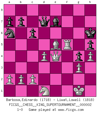 Last move : 1-0 2018 May 23 2:30:47 [Event "FICGS__CHESS__KING_SUPERTOURNAMENT__000002"] [Site "FICGS"] [Date "2018.05.01"] [Round "1"] [White "Barbosa,Edinardo"] [Black "Liwat,Lowell"] [Result "1-0"] [WhiteElo "1718"] [BlackElo "1818"] 1.e4 e5 2.f4 exf4 3.Nf3 g5 4.h4 g4 5.Ne5 h5 6.Bc4 Nh6 7.d4 d6 8.Nd3 Be7 9.Bxf4 f5 10.Nc3 c6 11.g3 fxe4 12.Nf2 d5 13.Bb3 Nf7 14.O-O Bf5 15.Qe2 Na6 16.Nfxe4 dxe4 17.Bxf7+ Kxf7 18.Be5 Qd7 19.Rxf5+ Kg6 20.Raf1 Rhf8 21.Rxf8 Rxf8 22.Qxe4+ Rf5 23.Nd1 Kh6 24.Rxf5 1-0 KGA : Kieseritsky, long whip (Stockwhip, Classical) defense Kingside Castling by player White (move 14) Player White won this chess game. Follow this game move after move (download)Adequate compensation for a sacrifice is having a sound combination leading to a winning position; adequate compensation for a blunder is having your opponent snatch defeat from the jaws of victory. (Bruce A. Moon) Über die Verhaftung Bobby Fischers: Warum es die Bush-Administration für nötig befindet einen 61 Jahre alten Mann zu hetzten, der für niemanden ausser sich selbste eine Gefahr darstellt ist ein Rätsel. (Nigel Short) La mitad de las variaciones que son calculadas en una partida de torneo, resultan ser completamente superfluas. Desafortunadamente, nadie sabe por adelantado cual mitad. (Jan Tinman) Dieu déplace le joueur, et celui-ci la pièce. Quel Dieu derrière Dieu commence donc la trame ? Arturo Perez-Reverte (prix de littérature policière 1993). Life doesn't imitate art, it imitates bad television. (Woody Allen)