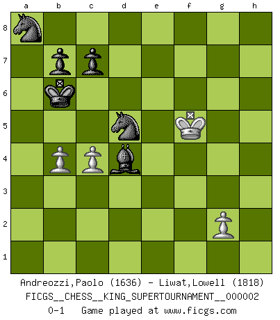 Last move : 0-1 2018 June 4 10:46:25 [Event "FICGS__CHESS__KING_SUPERTOURNAMENT__000002"] [Site "FICGS"] [Date "2018.05.01"] [Round "1"] [White "Andreozzi,Paolo"] [Black "Liwat,Lowell"] [Result "0-1"] [WhiteElo "1636"] [BlackElo "1818"] 1.e4 e5 2.f4 exf4 3.Nf3 g5 4.h3 Bg7 5.d4 h5 6.Qd2 d6 7.Nc3 g4 8.hxg4 hxg4 9.Rxh8 Bxh8 10.Ng1 Qh4+ 11.Qf2 Qxf2+ 12.Kxf2 Bxd4+ 13.Ke2 Bxg1 14.Bxf4 Be6 15.Nd5 Bxd5 16.exd5 Nf6 17.Bg5 Nxd5 18.c4 Nb6 19.Kd3 N6d7 20.Be2 Bb6 21.Ke4 Ne5 22.Rh1 Kd7 23.Rh8 a5 24.Rd8+ Kc6 25.a3 Bc5 26.Bf6 Ned7 27.Bc3 Nb6 28.b4 axb4 29.axb4 Bf2 30.Bd4 f5+ 31.Kxf5 Bxd4 32.Bd3 N8d7 33.Be4+ d5 34.Rxa8 Nxa8 35.Bxd5+ Kb6 36.Kxg4 Nf6+ 37.Kf5 Nxd5 0-1 King's knight's gambit 10 pieces endgame at move 37 : White KPPP , Black KBNNPP WHITE : King + 3 Pawns BLACK : King + 1 Bishop 2 Knights 2 Pawns Player Black won this chess game. Follow this game move after move (download)An attack on the wing should be met by play in the center. (Nimzovitch) Früher wurde jeder komplizierte Zug, jedes interessante Opfer mit großem Beifall und Enthusiasmus aufgenommen. Heute schaltet man einfach seinen Fritz an, und man kann sehen, was los ist, ob der Zug geht oder nicht. (Vladimir Kramnik) Bobby Fischer es el mas grande genio de Ajedrez de todos los tiempos. (Alexander Kotov) C'est la seule position que je connaisse où les deux camps sont mals. Propos prêtés à V. Anand. Do not put your faith in what statistics say until you have carefully considered what they do not say. (William W. Watt)