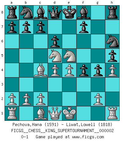 Last move : 0-1 2018 June 13 4:34:53 [Event "FICGS__CHESS__KING_SUPERTOURNAMENT__000002"] [Site "FICGS"] [Date "2018.05.01"] [Round "1"] [White "Pechova,Hana"] [Black "Liwat,Lowell"] [Result "0-1"] [WhiteElo "1591"] [BlackElo "1818"] 1.e4 e5 2.f4 exf4 3.Nf3 g5 4.h4 g4 5.Ne5 h5 6.Bc4 Nh6 7.d4 Qf6 8.Nc3 d6 9.Nd5 Qd8 0-1 KGA : Kieseritsky, long whip (Stockwhip, Classical) defense Player Black won this chess game. Follow this game move after move (download)Botvinnik tried to take the mystery out of Chess, always relating it to situations in ordinary life. He used to call Chess a typical inexact problem similar to those which people are always having to solve in everyday life. (Garry Kasparov) Ein Schachgenie ist jemand der verdammt gut Schach spielt. (Jonathan Levitt) Ayuda a tus piezas para que ellas te puedan ayudar. (Paul Morphy) Pour moi, les échecs ne sont pas un jeu mais un art. (Alexandre Alekhine) A married woman is like a fish riding a bicycle. (Rodolfo d'Ettorre)