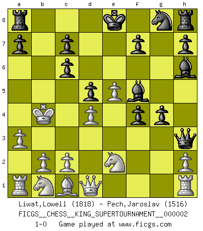 Last move : 1-0 2018 June 14 5:38:29 [Event "FICGS__CHESS__KING_SUPERTOURNAMENT__000002"] [Site "FICGS"] [Date "2018.05.01"] [Round "1"] [White "Liwat,Lowell"] [Black "Pech,Jaroslav"] [Result "1-0"] [WhiteElo "1818"] [BlackElo "1516"] 1.e4 e5 2.f4 exf4 3.Nf3 d5 4.e5 g5 5.d4 g4 6.Ng1 Qh4+ 7.Ke2 Bh6 8.Kd3 Bf5+ 9.Kc3 Nc6 10.a3 Qf2 11.Bb5 Qxg2 12.Bxc6+ bxc6 13.Ne2 Qh3+ 14.Kb4 1-0 KGA : Abbazia defense (Classical defense, Modern defense!) Player White won this chess game. Follow this game move after move (download)Life is a kind of Chess, with struggle, competition, good and ill events. (Benjamin Franklin) Je älter ich werde, um so mehr schätze ich die Bauern. (Paul Keres) Nunca nadie ha ganado una partida de Ajedrez rindiendose. (Unknown) Les Echecs, c'est l'art de la guerre sans les charniers, c'est la résurrection des morts tombés au champ d'honneur, l'espoir perpétuel, la suprématie de l'intelligence sur la force, la culture de l'esprit. (F. Szpiner) There's no money in correspondence chess. (John Knudsen)