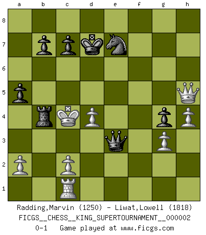 Last move : 0-1 2018 July 2 15:12:10 [Event "FICGS__CHESS__KING_SUPERTOURNAMENT__000002"] [Site "FICGS"] [Date "2018.05.01"] [Round "1"] [White "Radding,Marvin"] [Black "Liwat,Lowell"] [Result "0-1"] [WhiteElo "1250"] [BlackElo "1818"] 1.e4 e5 2.f4 exf4 3.Nf3 g5 4.h4 g4 5.Ng5 h5 6.e5 d5 7.d4 f6 8.exf6 Nxf6 9.Bxf4 Bd6 10.Qd2 Bf5 11.Nc3 O-O 12.O-O-O Nc6 13.Bd3 Bxd3 14.Qxd3 Bxf4+ 15.Kb1 Qe7 16.Rhe1 Qd7 17.Ne6 Ne4 18.Nxf4 Rxf4 19.g3 Rf3 20.Qb5 Nxc3+ 21.bxc3 Rxc3 22.Re7 Qxe7 23.Qxd5+ Kg7 24.Qxh5 Qe2 25.Qg5+ Kf7 26.Qd5+ Ke7 27.Qg5+ Ke8 28.Qg8+ Kd7 29.Qh7+ Ne7 30.Rc1 a5 31.Qh5 Ra6 32.Kb2 Rb6+ 33.Kxc3 Qe3+ 34.Kc4 Rb4+ 0-1 KGA : Allgaier gambit Kingside Castling by player Black (move 11) Queenside Castling by player White (move 12) Player Black won this chess game. Follow this game move after move (download)Dazzling combinations are for the many, shifting wood is for the few. (Georg Kieninger) Wer nie einen Fehler gemacht hat, hat nie etwas Neues ausprobiert. (Albert Einstein) Las Aperturas te enseñan aperturas. ¡Los Finales te enseñan Ajedrez!. (Stephan Gerzadowicz) Il n'y a pas eu de défaite parce que je ne crois pas que cet ordinateur ait jamais existé. IBM a triché en refusant d'imprimer les modes de recherche de la machine. C'est évident, pendant le match, des coups décisifs ont été joués par des êtres humains. Aujourd'hui, les meilleurs spécialistes en informatique ne peuvent toujours pas expliquer comment Deep-Blue a pu jouer contre la logique des ordinateurs. IBM a gagné une guerre de communication, mais ils sont incapables de prouver que l'ordinateur a gagné tout seul. (Garry Kasparov) I believe in luck. How else can you explain the success of those you dislike ? (Jean Cocteau)