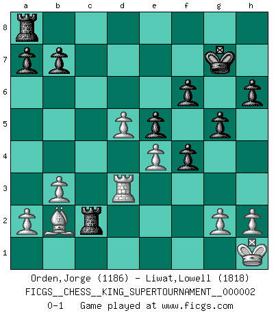 Last move : 0-1 2018 May 31 18:34:41 [Event "FICGS__CHESS__KING_SUPERTOURNAMENT__000002"] [Site "FICGS"] [Date "2018.05.01"] [Round "1"] [White "Orden,Jorge"] [Black "Liwat,Lowell"] [Result "0-1"] [WhiteElo "1186"] [BlackElo "1818"] 1.e4 e5 2.f4 exf4 3.Nf3 g5 4.b3 Bg7 5.d4 c5 6.Bb2 Nc6 7.Be2 cxd4 8.Nxd4 Nf6 9.Nf5 Kf8 10.Nxg7 Kxg7 11.O-O d6 12.c4 Ne5 13.Nd2 h6 14.Nf3 Qe7 15.Qc2 Bg4 16.Nxe5 dxe5 17.Bxg4 Nxg4 18.Qc3 f6 19.Rad1 Ne3 20.Rd5 Nxd5 21.cxd5 Rhc8 22.Qd3 Qc5+ 23.Kh1 Qe3 24.Rf3 Qxd3 25.Rxd3 Rc2 0-1 King's knight's gambit Kingside Castling by player White (move 11) Player Black won this chess game. Follow this game move after move (download)War is the child of passion, passion is the child of narcissism and narcissism is the child. (...) Another game ? (Thibault de Vassal) Ich war zu klein für die Schach-Schülermannschaft! (Woody Allen) Haz el enroque temprano y seguido. (Rob Sillars) Pour se monter efficace, un Cavalier a besoin d'avant-postes ! Les Cavaliers font les meilleurs bloqueurs de pions passés. It's not enough to succeed. Others must fail. (Gore Vidal)