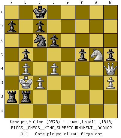 Last move : 0-1 2018 May 21 8:53:43 [Event "FICGS__CHESS__KING_SUPERTOURNAMENT__000002"] [Site "FICGS"] [Date "2018.05.01"] [Round "1"] [White "Kehayov,Yulian"] [Black "Liwat,Lowell"] [Result "0-1"] [WhiteElo "0973"] [BlackElo "1818"] 1.e4 e5 2.f4 exf4 3.d4 Qh4+ 4.g3 fxg3 5.Nf3 g2 6.Nxh4 gxh1Q 7.Nf3 d6 8.Qe2 Bg4 9.Nbd2 Nc6 10.c3 O-O-O 11.b3 Nf6 12.Bb2 Re8 13.O-O-O Bxf3 14.Nxf3 Rxe4 15.Qf2 Ng4 16.Qg3 f5 17.Bg2 Qxd1+ 18.Kxd1 Ne3+ 19.Kc1 Nxg2 20.Qxg2 g6 21.Kb1 Bh6 22.Bc1 Bxc1 23.Kxc1 Rhe8 24.Kb1 Rg4 25.Qf2 h5 26.h3 Rf4 27.Qg3 g5 28.Nxg5 Rf1+ 29.Kb2 Re2+ 30.Ka3 Ra1 31.b4 R1xa2+ 32.Kb3 b5 33.Qh4 Reb2+ 0-1 KGA : Villemson (Steinitz) gambit Promotion Queen by player Black (move 6) Queenside Castling by player Black (move 10) Queenside Castling by player White (move 13) Player Black won this chess game. Follow this game move after move (download)The game of Chess is not merely an idle amusement; several very valuable qualities of the mind are to be acquired and strengthened by it, so as to become habits ready on all occasions; for life is a kind of Chess. (Benjamin Franklin) Kasparov ist eine Art Monster mit hundert Augen, denen auch nicht das Geringste entgeht. (Tony Miles) Botvinnik trataba de restarle el misterio al Ajedrez, siempre relacionandolo a situaciones de la vida ordinaria. El gustaba de llamar al Ajedrez un típico problema inexacto similar a aquellos de los cuales la gente siempre tiene que enfrentarse en la vida cotidiana. (Garry Kasparov) Le système Elo représente seulement une moyenne. Il est simplement un indicateur de votre stabilité. (Anatoli Karpov) Creativity is allowing yourself to make mistakes. Art is knowing which ones to keep. (Scott Adams)