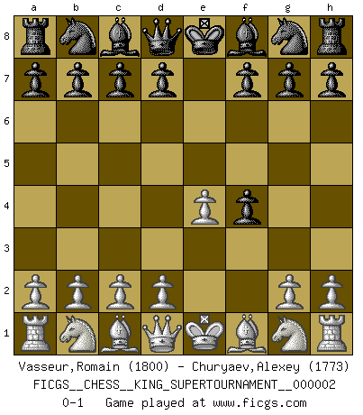 Last move : 0-1 2018 June 5 13:2:16 [Event "FICGS__CHESS__KING_SUPERTOURNAMENT__000002"] [Site "FICGS"] [Date "2018.05.01"] [Round "1"] [White "Vasseur,Romain"] [Black "Churyaev,Alexey"] [Result "0-1"] [WhiteElo "1800"] [BlackElo "1773"] 1.e4 e5 2.f4 exf4 0-1 This chess game has been lost on time (started : 2018.05.01 22:10:15) King's gambit accepted Player Black won this chess game. Follow this game move after move (download)Some part of a mistake is always correct. (Savielly Tartakover) Schach ist Kampf, hauptsächlich jedoch gegen die eigenen Fehler. (Savielly Grigorievitsch Tartakower) El Ajedrez es como la guerra en un tablero. (Bobby Fischer) 'L'échange des dames est un coup dur pour les deux adversaires...' Un journaliste lors d'une partie du match Spassky-Fischer Always remember that you are unique; just like everyone else. (Unknown)