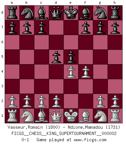 Last move : 0-1 2018 June 2 12:44:50 [Event "FICGS__CHESS__KING_SUPERTOURNAMENT__000002"] [Site "FICGS"] [Date "2018.05.01"] [Round "1"] [White "Vasseur,Romain"] [Black "Ndione,Mamadou"] [Result "0-1"] [WhiteElo "1800"] [BlackElo "1731"] 1.e4 e5 2.f4 d5 0-1 This chess game has been lost on time (started : 2018.05.01 22:10:15) KGD : Falkbeer counter-gambit Player Black won this chess game. Follow this game move after move (download)Chess is thirty to forty percent psychology. You don't have this when you play a computer. I can't confuse it. (Judith Polgar) Du kannst im Schach nur gut werden, wenn du das Spiel liebst. (Robert James Fischer) El Ajedrez es un juego terrible. Si no dominas el centro, tu oponente tiene una posición mas libre. Si tu tienes el centro, entonces realmente tienes algo de que preocuparte. (Siegbert Tarrasch) À la honte des hommes, on sait que les lois du jeu sont les seules qui soient partout justes, claires, inviolables et exécutées. Pourquoi l'Indien qui a donné les règles du jeu d'échecs est-il obéi de bon gré dans toute la terre, et que les décrétales des papes, par exemple, sont aujourd'hui un objet d'horreur et de mépris ? C'est que l'inventeur des échecs combina tout avec justesse pour la satisfaction des joueurs, et que les papes, dans leurs décrétales, n'eurent en vue que leur seul avantage. L'Indien voulut exercer également l'esprit des hommes et leur donner du plaisir; les papes ont voulu abrutir l'esprit des hommes. Voltaire (Dictionnaire philosophique / Garnier 1967) The age of a woman doesn't mean a thing. The best tunes are played on the oldest fiddles. (Ralph Waldo Emerson)
