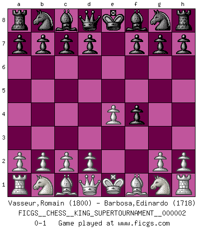Last move : 0-1 2018 June 3 0:45:49 [Event "FICGS__CHESS__KING_SUPERTOURNAMENT__000002"] [Site "FICGS"] [Date "2018.05.01"] [Round "1"] [White "Vasseur,Romain"] [Black "Barbosa,Edinardo"] [Result "0-1"] [WhiteElo "1800"] [BlackElo "1718"] 1.e4 e5 2.f4 exf4 0-1 This chess game has been lost on time (started : 2018.05.01 22:10:15) King's gambit accepted Player Black won this chess game. Follow this game move after move (download)You may learn much more from a game you lose than from a game you win. You will have to lose hundreds of games before becoming a good player. (Jose Raul Capablanca) Wenn du gegen Bobby spielst, ist es keine Frage von gewinnen oder verlieren. Es ist eine Frage des Überlebens. (Boris Vassilievich Spassky) Existen dos clases de sacrificios: los correctos y los míos. (Mikhail Tal) Vous savez, camarade Pachman, je n'éprouve pas de plaisir à être ministre, je jouerais plutôt aux échecs comme vous, ou alors ferais une révolution au Venezuela. (Che Guevara à Ludek Pachman, 'Checkmate in Prague', 1975) When I took office, only high energy physicists had ever heard of what is called the World Wide Web... Now even my cat has its own page. (Bill Clinton, 1996)