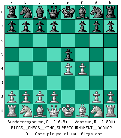Last move : 1-0 2018 June 1 0:38:7 [Event "FICGS__CHESS__KING_SUPERTOURNAMENT__000002"] [Site "FICGS"] [Date "2018.05.01"] [Round "1"] [White "Sundararaghavan,Shailesh"] [Black "Vasseur,Romain"] [Result "1-0"] [WhiteElo "1649"] [BlackElo "1800"] 1.e4 e5 2.f4 1-0 This chess game has been lost on time (started : 2018.05.01 22:10:15) King's gambit Player White won this chess game. Follow this game move after move (download)No price is too great for the scalp of the enemy King. (Koblentz) Unter Putin wird alles Geld aus Russland wie von einem Staubsauger nach Moskau umgeleitet, das ist wie ein schwarzes Loch. (Garry Kasparov) De eso se trata el Ajedrez. Un día le das una lección a tu oponente y al día siguiente el te da una a tí. (Bobby Fischer) Je menace de comprendre la position. (Anonyme) Kids, you tried your best and you failed miserably. The lesson is, never try. (Simpsons)