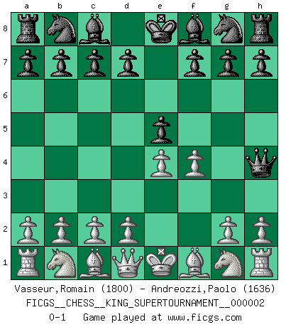 Last move : 0-1 2018 June 1 12:40:23 [Event "FICGS__CHESS__KING_SUPERTOURNAMENT__000002"] [Site "FICGS"] [Date "2018.05.01"] [Round "1"] [White "Vasseur,Romain"] [Black "Andreozzi,Paolo"] [Result "0-1"] [WhiteElo "1800"] [BlackElo "1636"] 1.e4 e5 2.f4 Qh4+ 0-1 This chess game has been lost on time (started : 2018.05.01 22:10:15) King's gambit Player Black won this chess game. Follow this game move after move (download)Chess teaches you to control the initial excitement you feel when you see something that looks good and it trains you to think objectively when you're in trouble. (Stanley Kubrick) Weshalb minderdergeübte Spieler mit g2-g4 beginnen? Die betreffenden sind unschlüssig, ob sie nun rechts (h4) oder links (f4) beginnen sollen, und in ihrer Ratlosigkeit entschliessen sie sich nach guter Bürgerart dazu, den goldenen Mittelweg zu wählen. (Aaron Nimzowitsch) ¿Cual es el objetivo de jugar una apertura de gambito?... Para adquirir una reputación de ser un jugador apuesto a costo de perder el juego. (Siegbert Tarrasch) J'ai vu le vaincu d'Echecs jouer des années durant dans l'espoir de la fête de la victoire. Car tu es plus riche de ce qu'elle existe si même elle n'est point pour toi. Ainsi de la perle du fond des mers. (Antoine de Saint-Exupéry) The hypothalamus is one of the most important parts of the brain, involved in many kinds of motivation, among other functions. The hypothalamus controls the 'Four Fs: Fighting, Fleeing, Feeding and Mating. (Unknown author)
