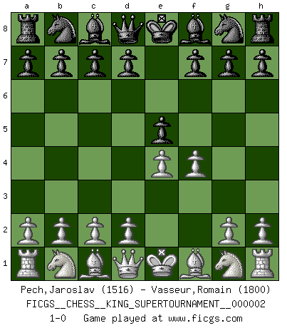 Last move : 1-0 2018 June 1 0:38:7 [Event "FICGS__CHESS__KING_SUPERTOURNAMENT__000002"] [Site "FICGS"] [Date "2018.05.01"] [Round "1"] [White "Pech,Jaroslav"] [Black "Vasseur,Romain"] [Result "1-0"] [WhiteElo "1516"] [BlackElo "1800"] 1.e4 e5 2.f4 1-0 This chess game has been lost on time (started : 2018.05.01 22:10:15) King's gambit Player White won this chess game. Follow this game move after move (download)Of Chess it has been said that life is not long enough for it, but that is the fault of life, not Chess. (William Ewart Napier) Schach ist ein Reich, wo sich die menschliche Phantasie frei entfalten kann. (David Bronstein) Yo no le temo a Spassky. Todos saben que yo soy el mejor. Uno no necesita un torneo para probarlo. (Bobby Fischer) Echiquier : carré parfait, comme la Jérusalem nouvelle décrite par l'auteur de l'Apocalypse, huit cases sur huit, exaltation du chiffre 4, symbole du cosmos aux quatre horizons... où le noir et le blanc, l'ombre et la lumière, le mal et le bien s'entremêlent et se conjuguent. (Robert Couffignal, Le Gambit du poète) History is the quarrels of popes and kings, with wars or pestilences in every page; the men all so good for nothing, and hardly any women at all. (Jane Austen)