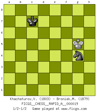 Last move : 1/2-1/2 2007 September 3 22:22:41 [Event "FICGS__CHESS__RAPID_A__000019"] [Site "FICGS"] [Date "2007.05.03"] [Round "1"] [White "Khachaturov,Vadim"] [Black "Broniek,Mariusz Maciej"] [Result "1/2-1/2"] [WhiteElo "1803"] [BlackElo "1879"] 1.e4 c5 2.Nf3 d6 3.d4 cxd4 4.Nxd4 Nf6 5.Nc3 Nc6 6.Bg5 e6 7.Qd2 a6 8.O-O-O h6 9.Be3 Be7 10.f4 Bd7 11.Be2 b5 12.Bf3 Rc8 13.e5 dxe5 14.Nxc6 Bxc6 15.Qxd8+ Bxd8 16.fxe5 Nd7 17.Ne4 Bxe4 18.Bxe4 Bg5 19.Bxg5 hxg5 20.Bb7 Rd8 21.Rd6 Nb8 22.Rxd8+ Kxd8 23.Rf1 Ke7 24.h3 a5 25.a3 Rh4 26.Rf3 b4 27.g4 Nd7 28.Re3 Rh8 29.axb4 axb4 30.Bc6 Nc5 31.Kd2 Rd8+ 32.Ke2 Rb8 33.Kd2 f5 34.exf6+ gxf6 35.Bg2 Rd8+ 36.Ke2 e5 37.Be4 Ne6 38.Kf2 Nf4 39.Rb3 Rd4 40.Ke3 Nxh3 41.c3 bxc3 42.bxc3 Rc4 43.Rb7+ Kd8 44.Rb8+ Kd7 45.Rb7+ Rc7 46.c4 Rxb7 47.Bxb7 Nf4 48.Ke4 Ne6 49.Kf5 Ke7 50.Bh1 Nd4+ 51.Kg6 Nb3 52.Kf5 Nd2 53.c5 Nf1 54.Kg6 Ng3 55.Bb7 Ne2 56.Bh1 Nd4 57.Be4 Ne6 58.c6 Nc5 59.Bf5 Kd6 60.Kxf6 e4 61.c7 Kxc7 62.Bxe4 Nxe4+ 63.Kf5 Nf2 64.Kxg5 Nxg4 1/2-1/2 Comment by player 1 : Vadim Khachaturov : Thank You for the game, dear colleague Sicilian : Richter-Rauzer, Rauzer attack, 7...a6 Queenside Castling by player White (move 8) 10 pieces endgame at move 46 : White KBPP , Black KRNPPP WHITE : King + 1 Bishop 2 Pawns BLACK : King + 1 Rook 1 Knight 3 Pawns 9 pieces endgame at move 47 : White KBPP , Black KNPPP WHITE : King + 1 Bishop 2 Pawns BLACK : King + 1 Knight 3 Pawns 8 pieces endgame at move 60 : White KBPP , Black KNPP WHITE : King + 1 Bishop 2 Pawns BLACK : King + 1 Knight 2 Pawns 7 pieces endgame at move 61 : White KBP , Black KNPP WHITE : King + 1 Bishop 1 Pawn BLACK : King + 1 Knight 2 Pawns 6 pieces endgame at move 62 : White KBP , Black KNP WHITE : King + 1 Bishop 1 Pawn BLACK : King + 1 Knight 1 Pawn 5 pieces endgame at move 62 : White KP , Black KNP WHITE : King + 1 Pawn BLACK : King + 1 Knight 1 Pawn 4 pieces endgame at move 64 : White KP , Black KN WHITE : King + 1 Pawn BLACK : King + 1 Knight 3 pieces endgame at move 64 : White K , Black KN WHITE : King + BLACK : King + 1 Knight This chess game ended in a draw. Follow this game move after move (download)The most important feature of the Chess position is the activity of the pieces. This is absolutely fundamental in all phases of the game: Opening, Middlegame and especially Endgame. The primary constraint on a piece's activity is the Pawn structure. (Michael Stean) Wie kann ich Remis annehmen? Ich weiß ja gar nicht, wie ich stehe! (Fritz Sämisch) Sin errores no puede haber brillantez. (Emanuel Lasker) Il vaut toujours mieux jouer un plan faux de façon logique que de n'avoir pas de plan du tout. (Victor Kortchnoï) There are 10 types of people in this world: those who understand binary and those who don't. (Anonymous)