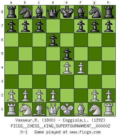 Last move : 0-1 2018 June 1 12:40:23 [Event "FICGS__CHESS__KING_SUPERTOURNAMENT__000002"] [Site "FICGS"] [Date "2018.05.01"] [Round "1"] [White "Vasseur,Romain"] [Black "Coggiola,Leandro Damian"] [Result "0-1"] [WhiteElo "1800"] [BlackElo "1392"] 1.e4 e5 2.f4 d6 0-1 This chess game has been lost on time (started : 2018.05.01 22:10:15) King's gambit Player Black won this chess game. Follow this game move after move (download)Chess is the art of analysis. (Mikhail Botvinnik) Wir irren allesamt, nur jeder irrt anders. (Georg Christoph Lichtenberg) Al jugar al Ajedrez entonces, podemos aprender: Primero: Previsión... Segundo: Prudencia... Tercero: Cautela... Y al final, aprendemos del Ajedrez el hábito de no ser desanimados por apariencias malas presentes en el estado de nuestros asuntos, el hábito de la esperanza por una oportunidad favorable y la perseveración de los secretos de los recursos. (Benjamin Franklin) La guerre est enfant de la passion, la passion est enfant du narcissisme et le narcissisme est l'enfant. (...) Une autre partie ? (Thibault de Vassal) The next best thing to gambling and winning is gambling and loosing. (Nick Dandalos)