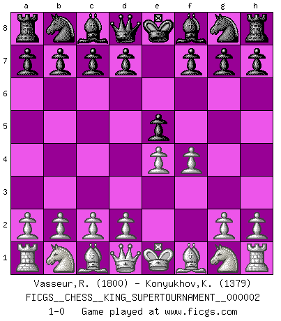 Last move : 1-0 2018 June 1 0:38:7 [Event "FICGS__CHESS__KING_SUPERTOURNAMENT__000002"] [Site "FICGS"] [Date "2018.05.01"] [Round "1"] [White "Vasseur,Romain"] [Black "Konyukhov,Konstantin"] [Result "1-0"] [WhiteElo "1800"] [BlackElo "1379"] 1.e4 e5 2.f4 1-0 This chess game has been lost on time (started : 2018.05.01 22:10:15) King's gambit Player White won this chess game. Follow this game move after move (download)The blunders are all there on the board, waiting to be made. (Savielly Tartakover) Ein Teil des Fehlers ist immer korrekt. (Savielly Grigorievitsch Tartakower) Yo no creo en la psicología. Yo creo en las buenas movidas. (Bobby Fischer) Le profane ne songe pas à la somme de jouissance dont il se prive, qui méconnaît ce jeu aux ressources aussi variées que passionnantes. (Jean-Marie Jeanton-Lamarche) I just play for fun. (Anna Kournikova)