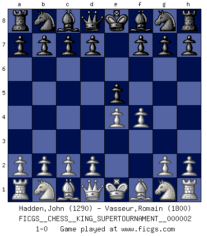 Last move : 1-0 2018 June 1 0:38:7 [Event "FICGS__CHESS__KING_SUPERTOURNAMENT__000002"] [Site "FICGS"] [Date "2018.05.01"] [Round "1"] [White "Hadden,John"] [Black "Vasseur,Romain"] [Result "1-0"] [WhiteElo "1290"] [BlackElo "1800"] 1.e4 e5 2.f4 1-0 This chess game has been lost on time (started : 2018.05.01 22:10:15) King's gambit Player White won this chess game. Follow this game move after move (download)I'm not a materialistic person, in that, I don't suffer the lack or loss of money. The absence of worldly goods I don't look back on. For Chess is a way I can be as materialistic as I want without having to sell my soul. (Jamie Walter Adams) Ich würde die 30 stärksten Spieler der USA im Simultanspiel besiegen. (José Raúl Capablanca) Estaba muy claro de que el punto vulnerable del Gran Maestro Americano (Bobby Fischer) radicaba en las posiciones de doble filo, colgantes, irracionales, donde el siempre falló en encontrar un triunfo aún en una posición de clara victoria. (Efim Geller) Ce qui est bien, c'est d'avoir tout un tas de pièces en prise : l'adversaire ne peut en prendre qu'une à la fois. Cité par Thierry Audin. The real danger is not that computers will begin to think like men, but that men will begin to think like computers. (Sydney J. Harris)