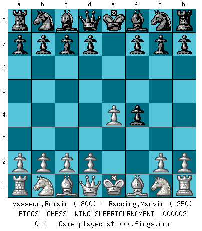 Last move : 0-1 2018 June 1 0:38:7 [Event "FICGS__CHESS__KING_SUPERTOURNAMENT__000002"] [Site "FICGS"] [Date "2018.05.01"] [Round "1"] [White "Vasseur,Romain"] [Black "Radding,Marvin"] [Result "0-1"] [WhiteElo "1800"] [BlackElo "1250"] 1.e4 e5 2.f4 exf4 0-1 This chess game has been lost on time (started : 2018.05.01 22:10:15) King's gambit accepted Player Black won this chess game. Follow this game move after move (download)Nonsense was the last thing Fischer was interested in, as far as Chess was concerned. (Elie Agur) Gegen einen Schachcomputer zu verlieren ist wie Löcher in den Strümpfen zuhaben. Es ist nicht peinlich, solange man der einzige ist der es weiß. (Anonymous) Diferente gente reacciona diferentemente en aceptar la derrota. (Bobby Fischer) 'L'échange des dames est un coup dur pour les deux adversaires...' Un journaliste lors d'une partie du match Spassky-Fischer Coffee just isn't my cup of tea. (Unknown)