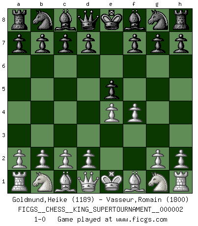 Last move : 1-0 2018 June 1 0:38:7 [Event "FICGS__CHESS__KING_SUPERTOURNAMENT__000002"] [Site "FICGS"] [Date "2018.05.01"] [Round "1"] [White "Goldmund,Heike"] [Black "Vasseur,Romain"] [Result "1-0"] [WhiteElo "1189"] [BlackElo "1800"] 1.e4 e5 2.f4 1-0 This chess game has been lost on time (started : 2018.05.01 22:10:15) King's gambit Player White won this chess game. Follow this game move after move (download)There are tough players and nice guys, and I'm a tough player. (Bobby Fischer) Der beste Spieler in einem Turnier gewinnt es nie. Er landet auf Platz zwei oder drei. (Siegbert Tarrasch) Una mala movida nulifica cuarenta buenas. (Horowitz) On entre au jeu d'Echecs comme on entre en Religion. Pour le joueur d'Echecs, la partie d'Echecs c'est l'office, la messe, le défilé du 1er Mai, le dépôt de gerbe au Monument aux Morts. C'est un drame sacré. (Michel Roos) The leaves of memory seemed to make a mournful rustling in the dark. (Henry Wadsworth Longfellow)