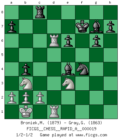 Last move : 1/2-1/2 2007 July 22 9:32:21 [Event "FICGS__CHESS__RAPID_A__000019"] [Site "FICGS"] [Date "2007.05.03"] [Round "1"] [White "Broniek,Mariusz Maciej"] [Black "Gray,Garvin"] [Result "1/2-1/2"] [WhiteElo "1879"] [BlackElo "1863"] 1.e4 c5 2.Nf3 d6 3.d4 cxd4 4.Nxd4 Nf6 5.Nc3 g6 6.Be3 Bg7 7.f3 O-O 8.Qd2 Nc6 9.Bc4 Bd7 10.O-O-O Qa5 11.h4 Ne5 12.Bb3 Rfc8 13.g4 b5 14.h5 Nc4 15.Bxc4 Rxc4 16.Kb1 b4 17.Nce2 Rac8 18.Rc1 Ne8 19.Nb3 Qb5 20.hxg6 fxg6 21.Nf4 Nf6 22.Qh2 Kf7 23.g5 Qxg5 24.Nd5 Qh5 25.Qxh5 Nxh5 26.Na5 R4c5 27.Bxc5 Rxc5 28.Nb3 Rb5 29.Rcd1 Rb8 30.f4 Bg4 31.Rd3 Be2 32.Rd2 Bf3 33.Re1 e6 34.Ne3 Bxe4 35.Rxd6 Rc8 36.Red1 Nxf4 1/2-1/2 Sicilian : Dragon, Yugoslav attack, 7...O-O Kingside Castling by player Black (move 7) Queenside Castling by player White (move 10) This chess game ended in a draw. Follow this game move after move (download)No Chess Grandmaster is normal; they only differ in the extent of their madness. (Viktor Korchnoi) Sie bekommen vielleicht den Eindruck, dass die Spitzenspieler überhaupt gar nicht so stark sind. Aber das stimmt nicht. Es ist eine Illusion. Mit einem Computer an der Seite ist es sehr leicht, Urteile zu fällen, aber wenn man alleine am Brett sitzt, sieht die Sache ganz anders aus. (Vladimir Kramnik) Debió haber existido una vez en que los hombres eran semidióses, de otra manera no hubiesen podido inventar el Ajedrez. (Gustav Schenk) Je fais ceci parce que dans cinquante coups j'obtiendrai cela; je m'appelle Mikhail Moisevitch Botvinnik. (Botvinnik) The only difference between a tax man and a taxidermist is that the taxidermist leaves the skin. (Mark Twain)