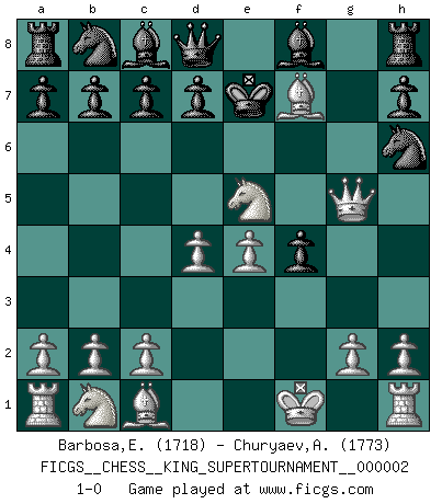 Last move : 1-0 2018 May 17 23:30:18 [Event "FICGS__CHESS__KING_SUPERTOURNAMENT__000002"] [Site "FICGS"] [Date "2018.05.01"] [Round "1"] [White "Barbosa,Edinardo"] [Black "Churyaev,Alexey"] [Result "1-0"] [WhiteElo "1718"] [BlackElo "1773"] 1.e4 e5 2.f4 exf4 3.Nf3 Be7 4.Bc4 Bh4+ 5.Kf1 Be7 6.d4 g5 7.Ne5 Nh6 8.Qh5 Bf8 9.Bxf7+ Ke7 10.Qxg5+ 1-0 KGA : Cunningham defense Player White won this chess game. Follow this game move after move (download)You know you're going to lose. Even when I was ahead I knew I was going to lose. - On playing against Fischer. (Andrew Soltis) Ja, ich habe einmal eine Blitzpartie gespielt, es war in einem Zug, 1929. --im Interview 1989 (Mikhail Moiseyevich Botvinik) El Ajedrez moderno está demasiado preocupado con cosas como la estructura de Peones. Olvidenlo, el Jaque Mate termina la partida. (Nigel Short) Echiquier : carré parfait, comme la Jérusalem nouvelle décrite par l'auteur de l'Apocalypse, huit cases sur huit, exaltation du chiffre 4, symbole du cosmos aux quatre horizons... où le noir et le blanc, l'ombre et la lumière, le mal et le bien s'entremêlent et se conjuguent. (Robert Couffignal, Le Gambit du poète) 98% of all statistics are made up. (Author unknown)