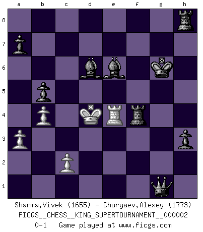 Last move : 0-1 2018 May 20 18:30:38 [Event "FICGS__CHESS__KING_SUPERTOURNAMENT__000002"] [Site "FICGS"] [Date "2018.05.01"] [Round "1"] [White "Sharma,Vivek"] [Black "Churyaev,Alexey"] [Result "0-1"] [WhiteElo "1655"] [BlackElo "1773"] 1.e4 e5 2.f4 exf4 3.d4 Qh4+ 4.g3 fxg3 5.Bg2 gxh2 6.Kf1 hxg1Q+ 7.Kxg1 Qe7 8.Bf4 d6 9.Nc3 c6 10.Qh5 Nf6 11.Qh2 h5 12.e5 Ng4 13.Qg3 d5 14.Bh3 f5 15.Re1 Be6 16.Na4 g5 17.Bd2 f4 18.Qf3 Nd7 19.Qb3 b5 20.Nc3 f3 21.Bxg4 Bxg4 22.Nd1 Be6 23.Qxf3 g4 24.Qc3 c5 25.dxc5 Qxc5+ 26.Ne3 d4 27.Qxc5 Bxc5 28.Nd1 Kf7 29.b4 Bb6 30.a3 h4 31.Rf1+ Kg6 32.Re1 d3 33.Ne3 Nxe5 34.Rd1 Nf3+ 35.Kg2 Nxd2 36.Rxd2 Bxe3 37.Rxd3 h3+ 38.Kg3 Bb6 39.Rd6 Bc7 40.Re1 Bxd6+ 41.Kf2 g3+ 42.Kf3 Raf8+ 43.Ke3 g2 44.Kd4 Rf4+ 45.Re4 g1Q+ 0-1 KGA : Villemson (Steinitz) gambit Promotion Queen by player Black (move 6) Promotion Queen by player Black (move 45) Player Black won this chess game. Follow this game move after move (download)First-class players lose to second class players because second-class players sometimes play a first-class game. (Tarrasch) Es ist nicht das erste mal, dass sich die FIDE dem Arabischen Geld gebeugt hat (über die FIDE WM 2004 in Lybien). (Larry Evans) Las ideas audaces son como las piezas del Ajedrez que avanzan hacia adelante. Ellas pueden ser vencidas, pero también pueden iniciar una partida victoriosa. (Goethe) RxDa4 pat (...) A married woman is like a fish riding a bicycle. (Rodolfo d'Ettorre)