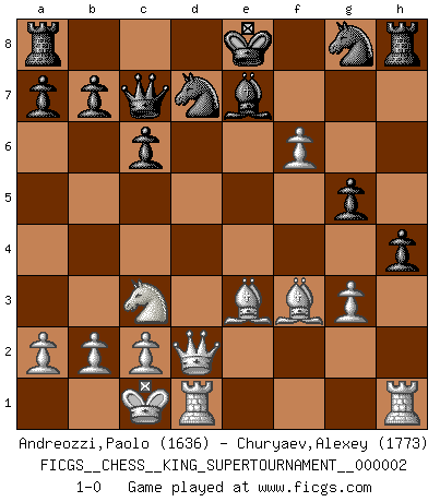 Last move : 1-0 2018 July 3 5:38:38 [Event "FICGS__CHESS__KING_SUPERTOURNAMENT__000002"] [Site "FICGS"] [Date "2018.05.01"] [Round "1"] [White "Andreozzi,Paolo"] [Black "Churyaev,Alexey"] [Result "1-0"] [WhiteElo "1636"] [BlackElo "1773"] 1.e4 e5 2.f4 exf4 3.Nf3 Be7 4.g3 fxg3 5.hxg3 d6 6.d4 Bg4 7.Bg2 c6 8.Nc3 Nd7 9.Bf4 Qc7 10.Qd2 f6 11.O-O-O g5 12.Be3 h5 13.e5 dxe5 14.dxe5 Bxf3 15.Bxf3 h4 16.exf6 1-0 This chess game has been lost on time (started : 2018.05.01 22:10:15) KGA : Cunningham defense Queenside Castling by player White (move 11) Player White won this chess game. Follow this game move after move (download)The essence of Chess is thinking about what Chess is. (David Bronstein) Im Fernschach kannst du während dem Spiel rauchen. (John Christen Knudsen) Aquel que teme a un Peón de Reina aislado, debería de retirarse del Ajedrez. (Siegbert Tarrasch) La vie et les Echecs sont tous les deux une lutte constante. (Lasker) Good luck. You're gonna need it. (Han Solo in Star Wars ep.6)