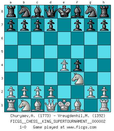 Last move : 1-0 2018 June 6 13:4:52 [Event "FICGS__CHESS__KING_SUPERTOURNAMENT__000002"] [Site "FICGS"] [Date "2018.05.01"] [Round "1"] [White "Churyaev,Alexey"] [Black "Vreugdenhil,Maarten"] [Result "1-0"] [WhiteElo "1773"] [BlackElo "1392"] 1.e4 e5 2.f4 exf4 3.Nf3 1-0 This chess game has been lost on time (started : 2018.05.01 22:10:15) King's knight's gambit Player White won this chess game. Follow this game move after move (download)Good positions don't win games, good moves do. (Gerald Abrahams) Im Wettkampf zwischen starken Meistern kommen Fehler sehr selten vor, deshalb ist es mit bloßem Warten nicht getan. (José Raúl Capablanca) Con el tiempo, empecé a progresar en partidas decisivas. Tal vez porque me di cuenta de una simple verdad: no solo estaba yo nervioso sino también mi oponente. (Mikhail Tal) À la honte des hommes, on sait que les lois du jeu sont les seules qui soient partout justes, claires, inviolables et exécutées. Pourquoi l'Indien qui a donné les règles du jeu d'échecs est-il obéi de bon gré dans toute la terre, et que les décrétales des papes, par exemple, sont aujourd'hui un objet d'horreur et de mépris ? C'est que l'inventeur des échecs combina tout avec justesse pour la satisfaction des joueurs, et que les papes, dans leurs décrétales, n'eurent en vue que leur seul avantage. L'Indien voulut exercer également l'esprit des hommes et leur donner du plaisir; les papes ont voulu abrutir l'esprit des hommes. Voltaire (Dictionnaire philosophique / Garnier 1967) My poor ole parrot... Is not in the circulation of displays ....poo hoo hoo :) (Wayne Lowrance's enigma)