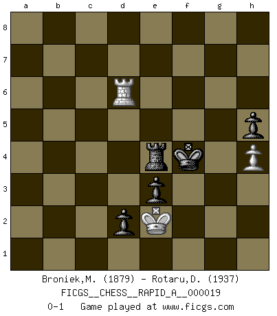 Last move : 0-1 2007 September 1 15:13:20 [Event "FICGS__CHESS__RAPID_A__000019"] [Site "FICGS"] [Date "2007.05.03"] [Round "1"] [White "Broniek,Mariusz Maciej"] [Black "Rotaru,Dan"] [Result "0-1"] [WhiteElo "1879"] [BlackElo "1937"] 1.e4 c6 2.d4 d5 3.exd5 cxd5 4.Nf3 Nf6 5.Bd3 Bg4 6.c3 Nc6 7.Bf4 e6 8.Qb3 Qc8 9.Ne5 Bh5 10.h3 Nxe5 11.Bxe5 Bg6 12.Be2 Nd7 13.Bh2 Be7 14.O-O O-O 15.Nd2 Nb8 16.Nf3 Nc6 17.Rfe1 Be4 18.Qd1 Qd8 19.Bd3 Bxd3 20.Qxd3 Rc8 21.Re3 Bd6 22.Bxd6 Qxd6 23.Ng5 g6 24.Rae1 Qf4 25.Rg3 Ne7 26.Rg4 Qb8 27.Nf3 Qd6 28.h4 h5 29.Rg5 Kg7 30.Ne5 Rh8 31.Qf3 Nf5 32.Qf4 Rcf8 33.g3 Rh6 34.Nd3 Qxf4 35.Nxf4 Rc8 36.Kf1 Rc6 37.Kg2 b5 38.a3 a5 39.Ra1 Ra6 40.a4 b4 41.cxb4 axb4 42.Rxf5 gxf5 43.Nd3 Rh8 44.Nc5 Ra5 45.Nb3 Ra7 46.a5 Kf6 47.Kf3 Ke7 48.Ra4 Rb8 49.Nc5 Kd6 50.a6 b3 51.Ke3 Rb5 52.Nb7+ Kc6 53.Nc5 Rxc5 54.dxc5 Kxc5 55.Ra3 Kc4 56.Kd2 f6 57.Ra5 d4 58.Ra3 e5 59.Ke2 Kb5 60.Rxb3+ Kxa6 61.Ra3+ Kb6 62.Rf3 f4 63.gxf4 e4 64.Rb3+ Kc5 65.Rb8 Rg7 66.b4+ Kc6 67.Rf8 d3+ 68.Kd2 Rg2 69.Rxf6+ Kd5 70.Ke3 Rg1 71.b5 Re1+ 72.Kd2 Re2+ 73.Kc3 Rc2+ 74.Kb3 Rxf2 75.b6 Rf1 76.b7 Rb1+ 77.Kc3 Rxb7 78.Rf5+ Kd6 79.Rf6+ Ke7 80.Rf5 Rd7 81.Re5+ Kf6 82.Kd2 Re7 83.Rd5 e3+ 84.Ke1 d2+ 85.Ke2 Re8 86.Rd3 Kf5 87.Rd4 Re4 88.Rd6 Kxf4 0-1 Caro-Kann : Exchange variation Kingside Castling by player White (move 14) Kingside Castling by player Black (move 14) 10 pieces endgame at move 74 : White KRPPP , Black KRPPP WHITE : King + 1 Rook 3 Pawns BLACK : King + 1 Rook 3 Pawns 9 pieces endgame at move 77 : White KRPP , Black KRPPP WHITE : King + 1 Rook 2 Pawns BLACK : King + 1 Rook 3 Pawns 8 pieces endgame at move 88 : White KRP , Black KRPPP WHITE : King + 1 Rook 1 Pawn BLACK : King + 1 Rook 3 Pawns Player Black won this chess game. Follow this game move after move (download)One of these modest little moves may be more embarrassing to your opponent than the biggest threat. (Siegbert Tarrasch) Ein guter Spieler hat immer Glück. (José Raúl Capablanca) No volvere nunca a jugar contigo. Has insultado a mi amigo. - cuando un oponente se maldijo por una mala jugada (Miguel Najdorf) À la honte des hommes, on sait que les lois du jeu sont les seules qui soient partout justes, claires, inviolables et exécutées. Pourquoi l'Indien qui a donné les règles du jeu d'échecs est-il obéi de bon gré dans toute la terre, et que les décrétales des papes, par exemple, sont aujourd'hui un objet d'horreur et de mépris ? C'est que l'inventeur des échecs combina tout avec justesse pour la satisfaction des joueurs, et que les papes, dans leurs décrétales, n'eurent en vue que leur seul avantage. L'Indien voulut exercer également l'esprit des hommes et leur donner du plaisir; les papes ont voulu abrutir l'esprit des hommes. Voltaire (Dictionnaire philosophique / Garnier 1967) Drag your thoughts away from your troubles... by the ears, by the heels, or any other way you can manage it. (Mark Twain)