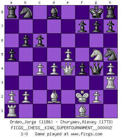 Last move : 1-0 2018 July 9 19:8:0 [Event "FICGS__CHESS__KING_SUPERTOURNAMENT__000002"] [Site "FICGS"] [Date "2018.05.01"] [Round "1"] [White "Orden,Jorge"] [Black "Churyaev,Alexey"] [Result "1-0"] [WhiteElo "1186"] [BlackElo "1773"] 1.e4 e5 2.f4 exf4 3.d4 Qh4+ 4.Ke2 Nf6 5.Nf3 Qg4 6.h3 Qg3 7.Qd3 b6 8.e5 Nh5 9.h4 Ba6 10.c4 Be7 11.Nc3 d5 12.Nxd5 Bd8 13.Bd2 c6 14.Nc3 Bc8 15.Ne4 Qg4 16.Nd6+ Kf8 17.Nxc8 Qxc8 18.Bb4+ Kg8 19.Kf2 Ng3 20.Rh3 a5 21.Bd2 Nh5 22.Qe4 Qg4 23.Ng5 1-0 This chess game has been lost on time (started : 2018.05.01 22:10:15) KGA : Villemson (Steinitz) gambit Player White won this chess game. Follow this game move after move (download)The older I grow, the more I value Pawns. (Keres) Die jungen Leute sollen verstehen, dass sie noch etwas von mir lernen können und müssen. (Viktor Kortschnoi) Una partida de Ajedrez se divide en 3 etapas: la primera cuando piensas que tienes la ventaja, la segunda cuando crees que tienes la ventaja y la tercera... ¡cuando te das cuenta que vas a perder!. (Savielly Tartakower) Vous n'êtes pas toujours obligé de jouer le meilleur coup. Un coup doit être actif, entreprenant, correct et beau ! (David Bronstein) Opportunities multiply as they are seized. (Sun Tzu)