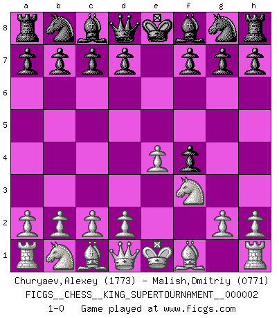 Last move : 1-0 2018 June 5 1:2:16 [Event "FICGS__CHESS__KING_SUPERTOURNAMENT__000002"] [Site "FICGS"] [Date "2018.05.01"] [Round "1"] [White "Churyaev,Alexey"] [Black "Malish,Dmitriy"] [Result "1-0"] [WhiteElo "1773"] [BlackElo "0771"] 1.e4 e5 2.f4 exf4 3.Nf3 1-0 This chess game has been lost on time (started : 2018.05.01 22:10:15) King's knight's gambit Player White won this chess game. Follow this game move after move (download)If your opponent cannot do anything active, then don't rush the position; instead you should let him sit there, suffer, and beg you for a draw. (Jeremy Silman) Er war ein guter Schachspieler, aber ich kann Leute nicht ausstehen, die 'Heil Hitler' rufen (Über Alexander Aljechin). (Miguel Najdorf) Cuando veas una buena jugada, trata de encontrar otra mejor. (Emanuel Lasker) Toutes les manuvres exécutées sur une colonne ouverte ont pour but ultime l'intrusion définitive sur la septième ou la huitième rangée, en plein cur de la position ennemie. (Aaron Nimzovitch) Fame, I have already. Now I need the money. (an elderly Steinitz)