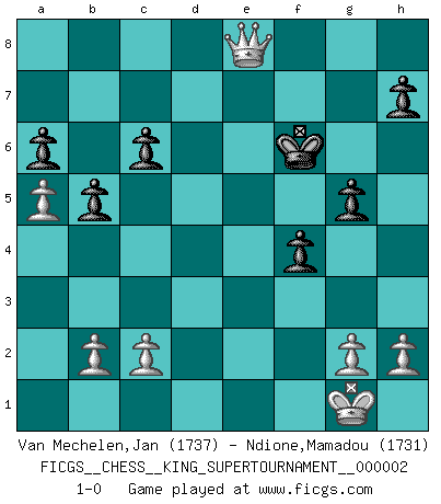 Last move : 1-0 2018 June 16 16:58:23 [Event "FICGS__CHESS__KING_SUPERTOURNAMENT__000002"] [Site "FICGS"] [Date "2018.05.01"] [Round "1"] [White "Van Mechelen,Jan"] [Black "Ndione,Mamadou"] [Result "1-0"] [WhiteElo "1737"] [BlackElo "1731"] 1.e4 e5 2.f4 d5 3.exd5 exf4 4.Nf3 Qxd5 5.Nc3 Qe6+ 6.Kf2 Be7 7.Bb5+ c6 8.Re1 Qf5 9.Ne4 Kf8 10.Bc4 b5 11.Bb3 Na6 12.Kg1 Nc5 13.Nxc5 Bxc5+ 14.d4 Bb6 15.a4 Bd7 16.a5 Bc7 17.Bd2 g5 18.Bb4+ Kg7 19.d5 Nf6 20.d6 Bd8 21.Re5 Qxe5 22.Nxe5 Re8 23.Qd4 Be6 24.d7 Rh8 25.Bxe6 fxe6 26.Bc3 Bc7 27.Ng4 e5 28.Nxe5 Rhf8 29.Ng4 Bd8 30.Qd6 a6 31.Re1 Rf7 32.Nxf6 Bxf6 33.Bxf6+ Rxf6 34.Qxf6+ Kxf6 35.Re8 Rxe8 36.dxe8Q 1-0 KGD : Falkbeer counter-gambit Promotion Queen by player White (move 36) Player White won this chess game. Follow this game move after move (download)When you don't know what to play, wait for an idea to come into your opponent's mind. You may be sure that idea will be wrong. (Siegbert Tarrasch) Zeige mir drei Eröffnungsvarianten und ich beweise dir, dass zwei davon inkorrekt sind. (Emanuel Lasker) Solo existe una cosa que Fischer hace en el Ajedrez sin placer: ¡perder!. (Boris Spassky) La vie et les Echecs sont tous les deux une lutte constante. (Lasker) Men should grow up. - Yeah. And dogs should stop licking themselves. It's not gonna happen. (Gregory House to Dr. Cameron, House M.D.)