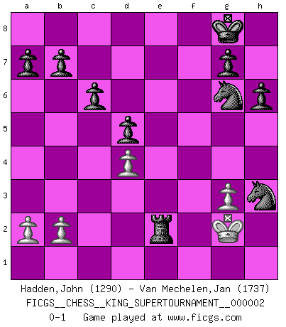 Last move : 0-1 2018 July 2 22:11:9 [Event "FICGS__CHESS__KING_SUPERTOURNAMENT__000002"] [Site "FICGS"] [Date "2018.05.01"] [Round "1"] [White "Hadden,John"] [Black "Van Mechelen,Jan"] [Result "0-1"] [WhiteElo "1290"] [BlackElo "1737"] 1.e4 e5 2.f4 exf4 3.d4 Qh4+ 4.Kd2 Qf2+ 5.Qe2 Qxd4+ 6.Qd3 Qxd3+ 7.cxd3 Bc5 8.Nf3 Be3+ 9.Kd1 Bxc1 10.Kxc1 Ne7 11.Nc3 O-O 12.Kd2 d5 13.e5 c6 14.Ne2 Ng6 15.d4 Bf5 16.g3 fxg3 17.hxg3 Nd7 18.Ng5 h6 19.Nf3 f6 20.exf6 Nxf6 21.Bh3 Ne4+ 22.Ke3 Bxh3 23.Rxh3 Rae8 24.Re1 Ng5 25.Kf2 Rxf3+ 26.Kg2 Rfe3 27.Kf2 Nxh3+ 28.Kg2 Rxe2+ 29.Rxe2 Rxe2+ 0-1 KGA : Villemson (Steinitz) gambit Kingside Castling by player Black (move 11) Player Black won this chess game. Follow this game move after move (download)Look at Garry Kasparov. After he loses, invariably he wins the next game. He just kills the next guy. That's something that we have to learn to be able to do. (Maurice Ashley) Der 70jährige Viktor Kortschnoi: Die Rentenanstalt wollte mich zwingen in Rente zu gehen. Meine Frau erhält jetzt eine Pension- und ich zahle weiter in die Rentenkasse ein! (Viktor Kortschnoi) Me dio la sensación de como si yo estuviera jugando en contra del mismo Ajedrez. - al estar jugando en contra de Robert Fischer (Walter Shipman) Demandez au pauvre Cg1 ce qu'il en pense. Eduard Gufeld à propos de la variante Saemisch de l'Est-Indienne. They say in chess you've got to kill the queen, and then you mate it... Oh I, do you ? (Red Hot Chili Peppers, Fortune faded)