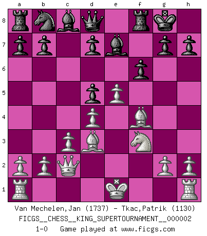 Last move : 1-0 2018 June 16 15:11:25 [Event "FICGS__CHESS__KING_SUPERTOURNAMENT__000002"] [Site "FICGS"] [Date "2018.05.01"] [Round "1"] [White "Van Mechelen,Jan"] [Black "Tkac,Patrik"] [Result "1-0"] [WhiteElo "1737"] [BlackElo "1130"] 1.e4 e5 2.f4 exf4 3.Nf3 Nf6 4.e5 Nd5 5.Nc3 c6 6.Nxd5 cxd5 7.d4 Bb4+ 8.c3 Be7 9.Bxf4 f6 10.Bd3 O-O 11.Qc2 1-0 This chess game has been lost on time (started : 2018.05.01 22:10:15) KGA : Schallop defense Kingside Castling by player Black (move 10) Player White won this chess game. Follow this game move after move (download)Nowadays, when you're not a grandmaster at 14, you can forget about it. (Anand Viswanathan) Nie in meinem Leben habe ich die französische Verteidigung gespielt, welche die Stumpfsinnigste von allen ist. (Wilhelm Steinitz) A la fecha, Fischer esta simplemente un nivel arriba de todos los mejores jugadores de Ajedrez del mundo. (John Jacobs) Les Cavaliers se révèlent fort utiles dans les positions fermées. D'habitude, les Fous sont un peu plus forts que les Cavaliers dans les positions ouvertes. Qu'on le veuille ou non, il restera toujours des exceptions ! For a mechanic, you seem to do an excessive amount of thinking. (C-3PO in Star Wars ep.2)