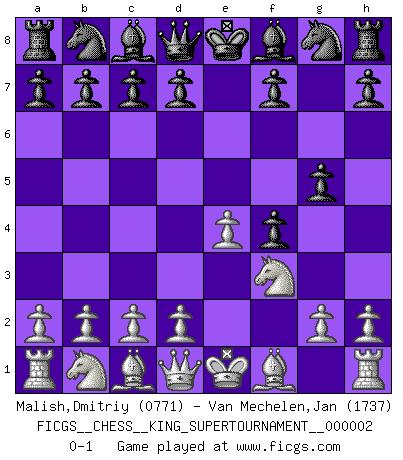 Last move : 0-1 2018 June 3 0:45:49 [Event "FICGS__CHESS__KING_SUPERTOURNAMENT__000002"] [Site "FICGS"] [Date "2018.05.01"] [Round "1"] [White "Malish,Dmitriy"] [Black "Van Mechelen,Jan"] [Result "0-1"] [WhiteElo "0771"] [BlackElo "1737"] 1.e4 e5 2.f4 exf4 3.Nf3 g5 0-1 This chess game has been lost on time (started : 2018.05.01 22:10:15) King's knight's gambit Player Black won this chess game. Follow this game move after move (download)A bad plan is better than none at all. (Frank Marshall) Im Schach nämlich geht es darum, daß Ich des Gegners klein zu kriegen, sein Ego zu zerbrechen und zu zermahlen, seine Selbstachtung zu zertreten und zu verscharren und seine ganze mißachtenswerte sogenannte Persönlichkeit ein für alle Mal tot zu hacken und zu zerstampfen und dadurch die menschliche Gesellschaft von einer stinkenden Pestbeule zu befreien. Es ist ein königliches Spiel. (Robert James Fischer) La enorme capacidad mental, en la que sin ella no puede un jugador de Ajedrez existir, es demasiado requerida por el Ajedrez al grado de que nunca podrá liberar su mente de este juego. (Albert Einstein) Je fais ceci parce que dans cinquante coups j'obtiendrai cela; je m'appelle Mikhail Moisevitch Botvinnik. (Botvinnik) Plans are ideas that never come to fruition. (Daniel Parmet)