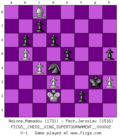 Last move : 0-1 2018 July 22 13:59:39 [Event "FICGS__CHESS__KING_SUPERTOURNAMENT__000002"] [Site "FICGS"] [Date "2018.05.01"] [Round "1"] [White "Ndione,Mamadou"] [Black "Pech,Jaroslav"] [Result "0-1"] [WhiteElo "1731"] [BlackElo "1516"] 1.e4 e5 2.f4 Bc5 3.Nf3 d6 4.h3 Nf6 5.Nc3 Nh5 6.f5 Ng3 7.Rh2 g6 8.d3 gxf5 9.a3 Rg8 10.Qd2 Rg6 11.Ne2 fxe4 12.Nxg3 exf3 13.Ne4 fxg2 14.Rxg2 Qh4+ 15.Kd1 Rxg2 16.Qxg2 Qh5+ 17.Be2 Qg6 18.Qf3 Nc6 19.c3 Be6 20.Nf6+ Ke7 21.Ng4 f5 22.Ne3 Rg8 23.Kc2 f4 24.Nd5+ Bxd5 25.Qxd5 Qg2 26.Qxg2 Rxg2 27.Kd1 Rg1+ 28.Kc2 Be3 29.Bg4 Rxc1+ 30.Rxc1 Bxc1 31.Kxc1 Kf6 32.Kd2 Kg5 33.b4 Ne7 34.c4 b6 35.Ke2 h5 36.Bd7 Nf5 37.a4 Nd4+ 38.Kd2 Kh4 39.a5 Kg3 40.axb6 axb6 41.b5 f3 42.Bc8 f2 0-1 KGD : Classical variation Player Black won this chess game. Follow this game move after move (download)Mistrust is the most necessary characteristic of the Chess player. (Siegbert Tarrasch) Die Arbeit ist etwas Unnatürliches. Die Faulheit allein ist göttlich. (Anatole France) Los Peones son nacidos libres, y aún así, se encuentran por doquier encadenados. (Rick Kennedy) Les pièces de l'échiquier étaient impitoyables. Elles le retenaient, elles l'absorbaient. Il y avait de l'horreur en cela, mais aussi une harmonie unique. Car, qu'y a-t-il dans le monde, à part les échecs ? (V. Nabokov) The good fighters of old first put themselves beyond the possibility of defeat, and then waited for an opportunity of defeating the enemy. (Sun Tzu)