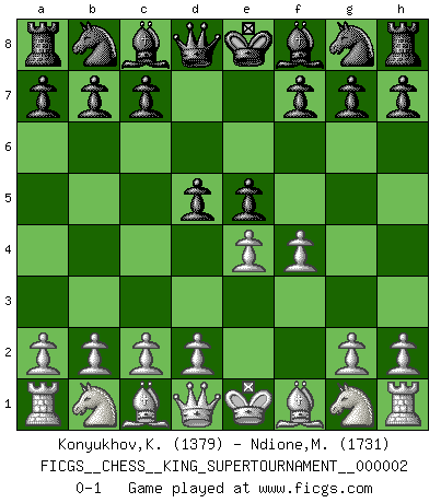 Last move : 0-1 2018 June 2 12:44:50 [Event "FICGS__CHESS__KING_SUPERTOURNAMENT__000002"] [Site "FICGS"] [Date "2018.05.01"] [Round "1"] [White "Konyukhov,Konstantin"] [Black "Ndione,Mamadou"] [Result "0-1"] [WhiteElo "1379"] [BlackElo "1731"] 1.e4 e5 2.f4 d5 0-1 This chess game has been lost on time (started : 2018.05.01 22:10:15) KGD : Falkbeer counter-gambit Player Black won this chess game. Follow this game move after move (download)With or without the title, Bobby Fischer was unquestionably the greatest player of his time. (Burt Hochberg) Schach ist eine Sache der genauen Beurteilung, wann man zuschlagen und wann man sich ducken muss. (Robert James Fischer) El Ajedrez, como la música, como el amor, tiene el poder de hacer feliz a la gente. (Siegbert Tarrasch) Toutes les manuvres exécutées sur une colonne ouverte ont pour but ultime l'intrusion définitive sur la septième ou la huitième rangée, en plein cur de la position ennemie. (Aaron Nimzovitch) You cannot beat a roulette table unless you steal money from it. (Albert Einstein)
