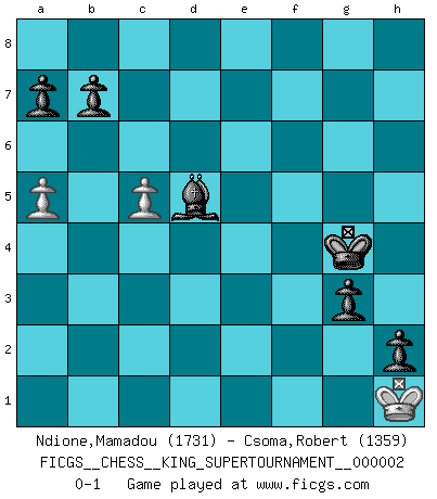 Last move : 0-1 2018 June 14 13:26:32 [Event "FICGS__CHESS__KING_SUPERTOURNAMENT__000002"] [Site "FICGS"] [Date "2018.05.01"] [Round "1"] [White "Ndione,Mamadou"] [Black "Csoma,Robert"] [Result "0-1"] [WhiteElo "1731"] [BlackElo "1359"] 1.e4 e5 2.f4 Nf6 3.fxe5 Nxe4 4.Nf3 d6 5.d3 Nc5 6.h3 dxe5 7.Nc3 Bd6 8.a3 O-O 9.b4 Ne6 10.Ne4 f5 11.Nxd6 cxd6 12.Bb2 Nd7 13.Qd2 Qc7 14.Be2 Nf6 15.g4 fxg4 16.hxg4 Nxg4 17.c3 Qb6 18.d4 exd4 19.c4 Bd7 20.Qd3 g6 21.Bc1 Rae8 22.O-O Nf4 23.Bxf4 Rxf4 24.Ng5 Ref8 25.Rxf4 Rxf4 26.Rf1 Rxf1+ 27.Kxf1 Qd8 28.Ne4 Qh4 29.Qxd4 Qh1+ 30.Qg1 Qxe4 31.Bxg4 Bxg4 32.Qg2 Qxg2+ 33.Kxg2 Be6 34.c5 dxc5 35.bxc5 Kf7 36.Kg3 Kf6 37.Kf4 g5+ 38.Ke4 h5 39.Kf3 g4+ 40.Kg3 Kg5 41.a4 h4+ 42.Kh2 g3+ 43.Kg2 Kg4 44.a5 h3+ 45.Kg1 h2+ 46.Kh1 Bd5+ 0-1 KGD : 2...Nf6 Kingside Castling by player Black (move 8) Kingside Castling by player White (move 22) 10 pieces endgame at move 34 : White KPP , Black KBPPPPP WHITE : King + 2 Pawns BLACK : King + 1 Bishop 5 Pawns 9 pieces endgame at move 35 : White KPP , Black KBPPPP WHITE : King + 2 Pawns BLACK : King + 1 Bishop 4 Pawns Player Black won this chess game. Follow this game move after move (download)Botvinnik tried to take the mystery out of Chess, always relating it to situations in ordinary life. He used to call Chess a typical inexact problem similar to those which people are always having to solve in everyday life. (Garry Kasparov) Ich könnte leicht behaupten: Ja,ja, Leonid Breschnew wollte nicht, daß ich Weltmeister werde. In der Tat war die Sache komplizierter. (Viktor Kortschnoi) Por tratar de evitar la pérdida de una pieza, muchas personas han perdido una partida de Ajedrez. (Savielly Tartakover) Assurément je connaissais par expérience le mystérieux attrait de ce jeu royal, le seul entre tous les jeux inventés par les hommes qui échappe souverainement à la tyrannie du hasard, le seul où l'on ne doive sa victoire qu'à son intelligence ou plutôt à une certaine forme d'intelligence. Mais n'est-ce pas déjà le limiter injurieusement que d'appeler les échecs un jeu ? N'est-ce pas une science, un art ou quelque chose qui, comme le cercueil de Mahomet entre ciel et terre, est suspendu entre l'un et l'autre, et qui réunit un nombre incroyable de contraires ? [...] C'est une pensée qui ne mène à rien, une mathématique qui n'établit rien, un art qui ne laisse pas d'uvre, une architecture sans matière; et il l'a prouvé néanmoins qu'il était plus durable, à sa manière, que les livres ou que tout autre monument, ce jeu unique qui appartient à tous les peuples et à tous les temps, et dont personne ne sait quel dieu en fit don à la terre pour tuer l'ennui, pour aiguiser l'esprit et stimuler l'âme. Où commence-t-il, où finit-il ? (Stefan Zweig) I find your interest interesting. (Gregory House, House M.D.)