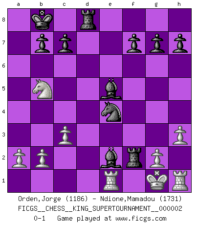Last move : 0-1 2018 June 5 17:7:3 [Event "FICGS__CHESS__KING_SUPERTOURNAMENT__000002"] [Site "FICGS"] [Date "2018.05.01"] [Round "1"] [White "Orden,Jorge"] [Black "Ndione,Mamadou"] [Result "0-1"] [WhiteElo "1186"] [BlackElo "1731"] 1.e4 e5 2.f4 d5 3.d3 dxe4 4.dxe4 Qxd1+ 5.Kxd1 Bg4+ 6.Be2 Nf6 7.Nc3 Nc6 8.fxe5 Nxe5 9.Nf3 O-O-O 10.Ke1 Nc6 11.h3 Bh5 12.Ng5 Nb4 13.Bd3 Nxd3+ 14.Kf1 Nxc1 15.Rxc1 Bd6 16.Nb5 Bg3 17.Nxa7+ Kb8 18.Nb5 Rd2 19.Nf3 Rf2+ 20.Kg1 Nxe4 21.Ne5 Bxe5 22.Re1 Be2 23.c3 Rd8 0-1 KGD : Falkbeer counter-gambit Queenside Castling by player Black (move 9) Player Black won this chess game. Follow this game move after move (download)No Chess Grandmaster is normal; they only differ in the extent of their madness. (Viktor Korchnoi) Mein erstes Ziel war nicht, die Partie zu gewinnen, sondern eine Figur zu opfern. -- der junge (Wilhelm Steinitz) El ganar no lo es todo... pero el perder es nada. (Mednis) La vérité est comme le meilleur coup aux échecs : elle existe, mais il faut la chercher. (Arturo Perez-Reverte) Life is pain my dear and anyone who says otherwise is selling something. (Princess Bride)