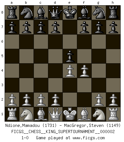 Last move : 1-0 2018 June 1 0:38:7 [Event "FICGS__CHESS__KING_SUPERTOURNAMENT__000002"] [Site "FICGS"] [Date "2018.05.01"] [Round "1"] [White "Ndione,Mamadou"] [Black "MacGregor,Steven"] [Result "1-0"] [WhiteElo "1731"] [BlackElo "1149"] 1.e4 e5 2.f4 1-0 This chess game has been lost on time (started : 2018.05.01 22:10:15) King's gambit Player White won this chess game. Follow this game move after move (download)All my games are real. (Bobby Fischer) Korrekt heißt in Deutschland die Haltung eines Mannes, dessen Benehmen nach dem Urteile seiner Nachbarn seiner Stellung angemessen ist. Um korrekt zu sein, muß man sich der Meinung der anderen anpassen... (Emanuel Lasker) Un Peón pasado es un criminal, quién debe ser mantenido bajo candado y llave. Leves medidas, tales como vigilancia policiaca, no son suficientes. (Aaron Nimzovich) Nous sommes les pions de la mystérieuse partie d'Echecs jouée par Dieu. Il nous déplace, nous arrête, nous pousse encore, puis nous lance un à un dans la boîte du Néant. Epitaphe sur la tombe de David Janowsky (1868-1927). If you have any trouble condescending, find a Unix user to show you how it's done. (Scott Adams)