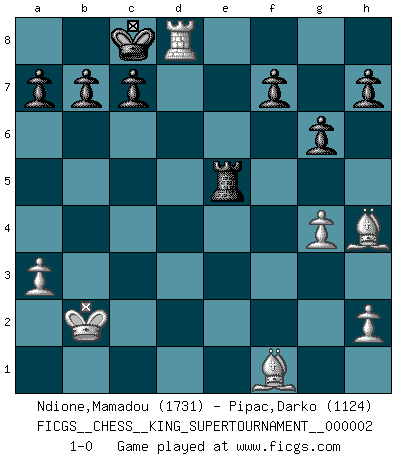 Last move : 1-0 2018 June 17 20:4:34 [Event "FICGS__CHESS__KING_SUPERTOURNAMENT__000002"] [Site "FICGS"] [Date "2018.05.01"] [Round "1"] [White "Ndione,Mamadou"] [Black "Pipac,Darko"] [Result "1-0"] [WhiteElo "1731"] [BlackElo "1124"] 1.e4 e5 2.f4 d5 3.d3 dxe4 4.fxe5 exd3 5.Qxd3 Qxd3 6.cxd3 Nc6 7.Nf3 Bb4+ 8.Nc3 Bg4 9.Bf4 Bxf3 10.gxf3 Nd4 11.O-O-O O-O-O 12.Rg1 Bxc3 13.bxc3 g6 14.cxd4 Rxd4 15.Be3 Ra4 16.Kb2 Ne7 17.Rd2 Nd5 18.Bf2 Rd8 19.Rg4 Rxg4 20.fxg4 Nb4 21.a3 Nxd3+ 22.Rxd3 Re8 23.Bh4 Rxe5 24.Rd8+ 1-0 KGD : Falkbeer counter-gambit Queenside Castling by player White (move 11) Queenside Castling by player Black (move 11) Player White won this chess game. Follow this game move after move (download)There are two classes of men; those who are content to yield to circumstances and who play whist; those who aim to control circumstances, and who play Chess. (Mortimer Collins) Was ist der Unterschied zwischen einem Strassenarbeiter und einem Schachspieler? --Der Schachspieler bewegt sich ab und zu. (Anonymous) La belleza de un movimiento no se refleja solo en su apariencia, sino en el pensamiento detrás de él. (Siegbert Tarrasch) Plusieurs personnes se sont demandées comment Tal faisait pour gagner... En fait, c'est très simple ! Il met ses pièces au centre de l'échiquier et les sacrifie quelque part ! (David Bronstein) Every man's memory is his private literature. (Aldous Huxley)