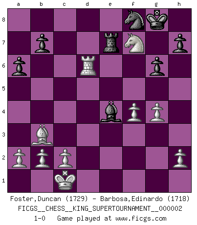 Last move : 1-0 2018 June 5 2:31:49 [Event "FICGS__CHESS__KING_SUPERTOURNAMENT__000002"] [Site "FICGS"] [Date "2018.05.01"] [Round "1"] [White "Foster,Duncan"] [Black "Barbosa,Edinardo"] [Result "1-0"] [WhiteElo "1729"] [BlackElo "1718"] 1.e4 e5 2.f4 d5 3.exd5 e4 4.d3 Nf6 5.dxe4 Nxe4 6.Nf3 Bc5 7.Qe2 Qe7 8.Be3 Bxe3 9.Qxe3 O-O 10.Nbd2 Re8 11.O-O-O Bf5 12.Bb5 Nxd2 13.Qxe7 Rxe7 14.Nxd2 Nd7 15.Rhe1 Rae8 16.Rxe7 Rxe7 17.Nf3 a6 18.Ba4 Nb6 19.Bb3 Be4 20.d6 cxd6 21.Rxd6 Nd7 22.Ne5 Nf8 23.g4 g6 24.Nxf7 1-0 KGD : Falkbeer, 5.de Kingside Castling by player Black (move 9) Queenside Castling by player White (move 11) Player White won this chess game. Follow this game move after move (download)My style is somewhere between that of Tal and Petrosian. (Reshevsky) Charakterschwächen offenbaren sich normalerweise während einer Schachpartie. (Garry Kasparov) No hay precio que sea tan grande por la cabellera del Rey enemigo. (Koblentz) Shah mat. Le roi est mort. Cri de fierté d'un joueur venant de terrasser son adversaire, courtoisement, sans effusion de sang. The Internet isn't free. It just has an economy that makes no sense to capitalism. (Brad Shapcott)