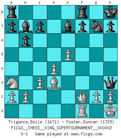Last move : 0-1 2018 July 27 20:14:47 [Event "FICGS__CHESS__KING_SUPERTOURNAMENT__000002"] [Site "FICGS"] [Date "2018.05.01"] [Round "1"] [White "Trigance,Emile"] [Black "Foster,Duncan"] [Result "0-1"] [WhiteElo "1671"] [BlackElo "1729"] 1.e4 e5 2.f4 exf4 3.Nf3 g5 4.Bc4 g4 5.O-O gxf3 6.Qxf3 Bc5+ 7.Kh1 Qf6 8.c3 Nc6 9.d4 Be7 10.e5 Qg7 11.Bxf4 b6 12.Be3 Nh6 13.Bxh6 Qxh6 14.Na3 O-O 15.Qd5 Bb7 16.Qxd7 Qg5 17.Qh3 Nd8 18.Bd3 Qh4 19.Qf5 Ne6 20.Rae1 Ng7 21.Qf2 Qh6 22.Re3 Kh8 23.Rh3 Qxh3 0-1 KGA : Muzio gambit Kingside Castling by player White (move 5) Kingside Castling by player Black (move 14) Player Black won this chess game. Follow this game move after move (download)Chess is a matter of delicate judgment, knowing when to punch and how to duck. (Bobby Fischer) Es war undenkbar für die Behörden, dass ein sowjetischer Großmeister auf diese Art und Weise [Fischer-Taimanov 6:0] verliert, ohne dass es eine politischer Erklärung dafür gäbe. (Mark Taimanov) Todavía soy una víctima del Ajedrez. Tiene toda la belleza del arte y mucho mas. No puede ser comercializado. El Ajedrez es mas puro que el arte en su posición social. (Marcel Duchamp) J'apprécie les joueurs d'est-indienne, c'est grâce à eux que je nourris ma famille depuis tant d'années. (Petrosian) It is not titles that honor men, but men that honor titles. (Niccolo Machiavelli)