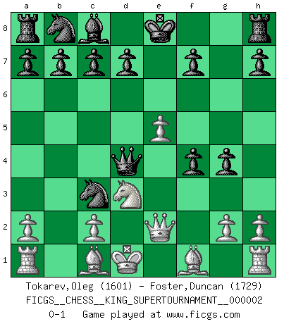 Last move : 0-1 2018 June 6 11:0:8 [Event "FICGS__CHESS__KING_SUPERTOURNAMENT__000002"] [Site "FICGS"] [Date "2018.05.01"] [Round "1"] [White "Tokarev,Oleg"] [Black "Foster,Duncan"] [Result "0-1"] [WhiteElo "1601"] [BlackElo "1729"] 1.e4 e5 2.f4 exf4 3.Nf3 g5 4.d4 g4 5.Ne5 Qh4+ 6.Kd2 Qf2+ 7.Qe2 Qxd4+ 8.Nd3 Nf6 9.Nc3 Bb4 10.e5 Ne4+ 11.Kd1 Bxc3 12.bxc3 Nxc3+ 0-1 KGA : Soerensen gambit Player Black won this chess game. Follow this game move after move (download)I like to say that Bobby Fischer was the greatest player ever. But what made Fischer a genius was his ability to blend an American freshness and pragmatism with Russian ideas about strategy. (Bruce Pandolfini) Kann Schach nicht schließlich das Nationalspiel der Deutschen werden? Und welche weiteren Ausblicke bieten sich dann dar! Welche Hebung des allgemeinen Kultur-Niveaus, ja der Moral, wenn das Schachbrett den Kartentisch verdrängen würde! Wahrlich, ein Ziel, des Schweißes der Edlen wert! (Siegbert Tarrasch) Aquellos que dicen entender al Ajedrez, no entienden nada. (Robert Hubner) Des idées, des idées, j'en ai cent, j'en ai mille. Des bonnes, des mauvaises, applicables, irréalisables... Il suffit de faire le tri ! (Roos) Who needs drugs and alcohol if he can play Big Chess at FICGS ? (Heinz-Georg Lehnhoff)