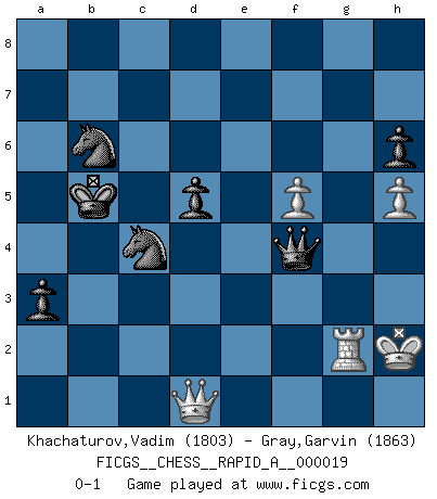 Last move : 0-1 2007 November 25 16:11:32 [Event "FICGS__CHESS__RAPID_A__000019"] [Site "FICGS"] [Date "2007.05.03"] [Round "1"] [White "Khachaturov,Vadim"] [Black "Gray,Garvin"] [Result "0-1"] [WhiteElo "1803"] [BlackElo "1863"] 1.d4 e6 2.e4 d5 3.Nc3 Bb4 4.e5 c5 5.a3 Bxc3+ 6.bxc3 Qc7 7.Qg4 f5 8.Qg3 cxd4 9.cxd4 Ne7 10.Bd2 O-O 11.Bd3 b6 12.Ne2 Ba6 13.Nf4 Qd7 14.h4 Bxd3 15.Qxd3 Rc8 16.h5 h6 17.O-O Rc4 18.c3 Nbc6 19.Qg3 Na5 20.Rfb1 Rac8 21.a4 R4c7 22.Nd3 Rxc3 23.Bxc3 Rxc3 24.Rc1 Rb3 25.Rd1 Nec6 26.Qf4 Rc3 27.Nc1 Qe8 28.Ne2 Rb3 29.Qh4 Rb4 30.Rab1 Rc4 31.Qh3 Rxa4 32.Ra1 Rc4 33.Rab1 Qe7 34.Rbc1 b5 35.Nf4 b4 36.Rxc4 Nxc4 37.Qb3 a5 38.Qa4 Qb7 39.Rb1 Kf7 40.Ne2 Ne7 41.Kh1 Qc6 42.Qd1 Na3 43.Rb2 Qb5 44.Kg1 Qc4 45.Kh2 Nc6 46.f3 Ke7 47.Kh3 Kd7 48.Kh2 Qa6 49.Ra2 Qb6 50.Rb2 Nb5 51.Rd2 Qd8 52.g3 Na3 53.Rb2 Nc4 54.Rb1 Qg5 55.Nf4 Qe7 56.Qa4 Kc7 57.Qd1 Na7 58.Ng6 Qd7 59.Nf4 Nb5 60.Qd3 Nc3 61.Rg1 Qe7 62.Kh3 Kd7 63.Rg2 Qf7 64.g4 fxg4+ 65.Rxg4 Nb5 66.Kg3 Nc7 67.Qc2 Kc6 68.Qa4+ Kb6 69.Kf2 Qe7 70.Qd1 Kb5 71.Nd3 Na8 72.Nc5 Nxe5 73.Qe2+ Nc4 74.Nxe6 b3 75.Rxg7 Qh4+ 76.Kg1 a4 77.Qd1 Nab6 78.Nc7+ Kc6 79.Na6 b2 80.Nb4+ Kb5 81.Na2 Qxd4+ 82.Qxd4 b1Q+ 83.Kh2 Qxa2+ 84.Rg2 Qb3 85.f4 a3 86.f5 Qe3 87.Qd1 Qf4+ 0-1 Queen's pawn Kingside Castling by player Black (move 10) Kingside Castling by player White (move 17) Promotion Queen by player Black (move 82) Player Black won this chess game. Follow this game move after move (download)Everything is in a state of flux, and this includes the world of Chess. (Mikhail Botvinnik) Ich würde die 30 stärksten Spieler der USA im Simultanspiel besiegen. (José Raúl Capablanca) Morphy probablemente fue el genio más grande de todos. (Bobby Fischer) Le jeu d'échecs est comme rejeté hors du temps. (Antoine de Saint-Exupéry) The right perception of any matter and a misunderstanding of the same matter do not wholly exclude each other. (Kafka's the trial)